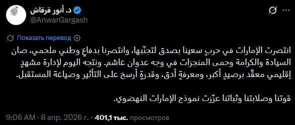 Цирк продолжается! В войне США и Ирана победили ОАЭ: мы вышли победителями в эпической национальной обороне, защитили суверенитет и достоинство, — советник президента страны