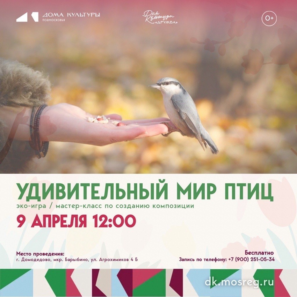 ✨ УДИВИТЕЛЬНЫЙ МИР ПТИЦ 🐦✨ Эко-игра / мастер-класс по созданию композиции 🌿🎨 🚫 Возраст: 0+ 📆 09.04.2026🕒12:00 🏢 Городской дом культуры «Дружба» 📍 г.о. Домодедово, мкрн.Барыбино, улица Агрохимиков, д.4Б 💰 Вход свободный❗️ ✅ Мероприятия Домодедово https://dzen.ru/id/66f10385cc4c5a16f7b5fb02 https://vk.ru/domodedovo_events http://dzen.ru/domodedovo_events