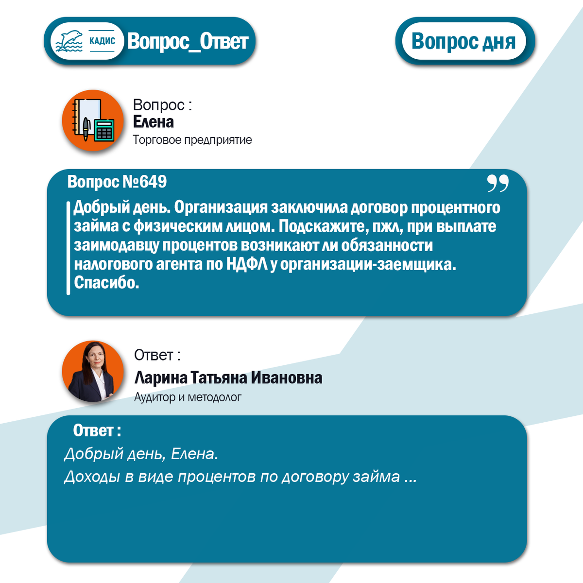 Добрый день. Организация заключила договор процентного займа с физическим лицом. Подскажите, пжл, при выплате заимодавцу процентов возникают ли обязанности налогового агента по НДФЛ у организации-заемщика. Спасибо. Ответ: Добрый день, Елена. Доходы в виде процентов по договору займа, полученные от российской организации, признаются доходом физического лица - заимодавца и подлежат обложению НДФЛ в установленном порядке (п. 1 ст. 41, ст. 209, п. 1 ст. 210 НК РФ, Письмо ФНС России от 09.10.2023 N БС-3-11/13021@). Датой фактического получения дохода в виде процентов по займу считается день выплаты дохода, в том числе перечисления дохода на счета налогоплательщика в банках либо по его поручению на счета третьих лиц (подп. 1 п. 1 ст. 223 НК РФ). Удержание НДФЛ с процентов производится непосредственно при их фактической выплате (п. 4 ст. 226 НК РФ). Таким образом, организация-заемщик как налоговый агент должна исчислить и удержать НДФЛ с доходов физического лица - заимодавца в виде процентов