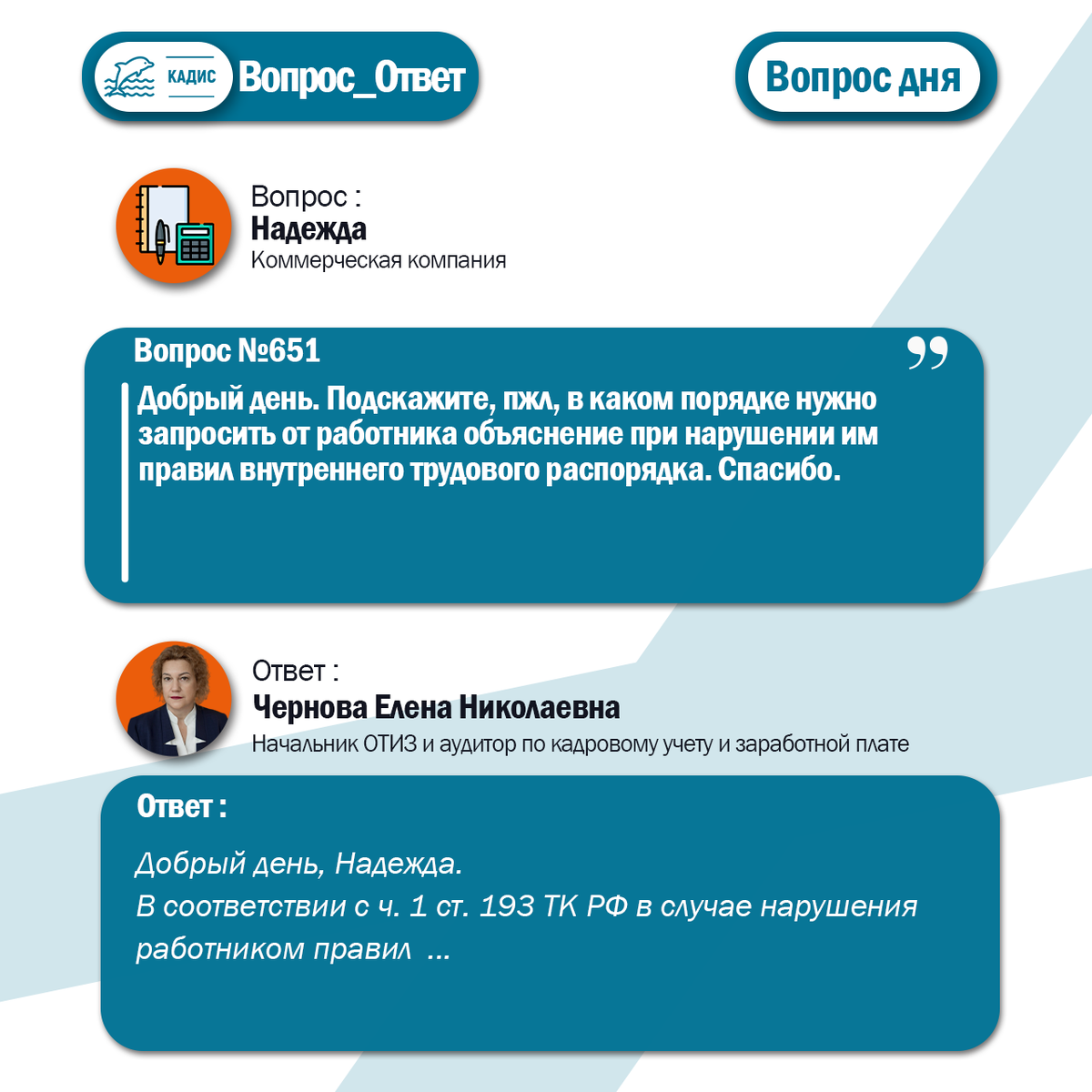 Добрый день. Подскажите, пжл, в каком порядке нужно запросить от работника объяснение при нарушении им правил внутреннего трудового распорядка. Спасибо. Ответ: Добрый день, Надежда. В соответствии с ч. 1 ст. 193 ТК РФ в случае нарушения работником правил внутреннего трудового распорядка, в том числе дисциплины, руководитель до применения дисциплинарного взыскания вправе затребовать от работника письменное объяснение. На подготовку объяснений в связи с дисциплинарным проступком статьей 193 ТК РФ предусмотрено два рабочих дня. Просьба о предоставлении объяснений должна быть документально оформлена в письменном виде в произвольной форме, в двух экземплярах, на одной из которых работник должен расписаться и указать дату ознакомления. Нормативно утвержденной формы нет. Если по истечении двух рабочих дней работник не предоставит объяснения, составляется соответствующий акт. Непредоставление работником объяснения не является препятствием для применения дисциплинарного взыскания.