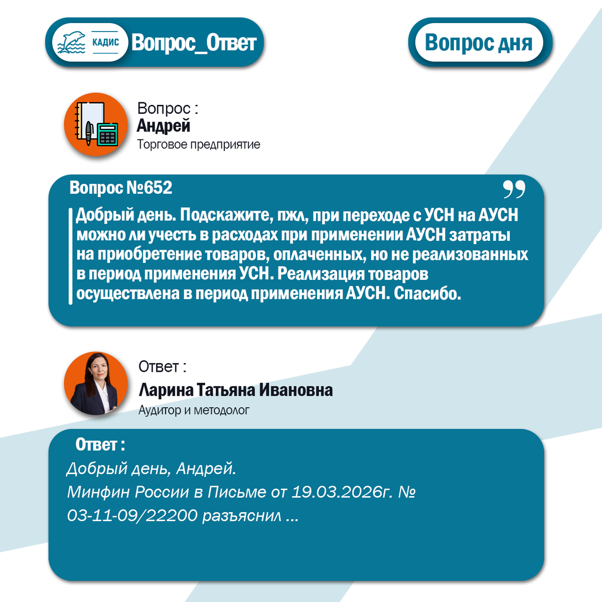 Добрый день. Подскажите, пжл, при переходе с УСН на АУСН можно ли учесть в расходах при применении АУСН затраты на приобретение товаров, оплаченных, но не реализованных в период применения УСН. Реализация товаров осуществлена в период применения АУСН. Спасибо. Ответ: Добрый день, Андрей. Минфин России в Письме от 19.03.2026г. №03-11-09/22200 разъяснил, можно ли учесть в расходах при применении АУСН затраты на приобретение товаров, осуществленных в период применения УСН. Расходы на оплату приобретенных товаров, но нереализованных в период применения УСН, при определении налоговой базы по налогу, уплачиваемому в связи с применением УСН, не учитываются. Обусловлено это тем, что расходы признаются по мере реализации указанных товаров. Расходы по оплате товаров, приобретенных налогоплательщиками в период применения УСН, но реализованных после перехода на АУСН, при определении налоговой базы по налогу, уплачиваемому в связи с применением АУСН, не учитываются. Обоснование ведомства следующее.