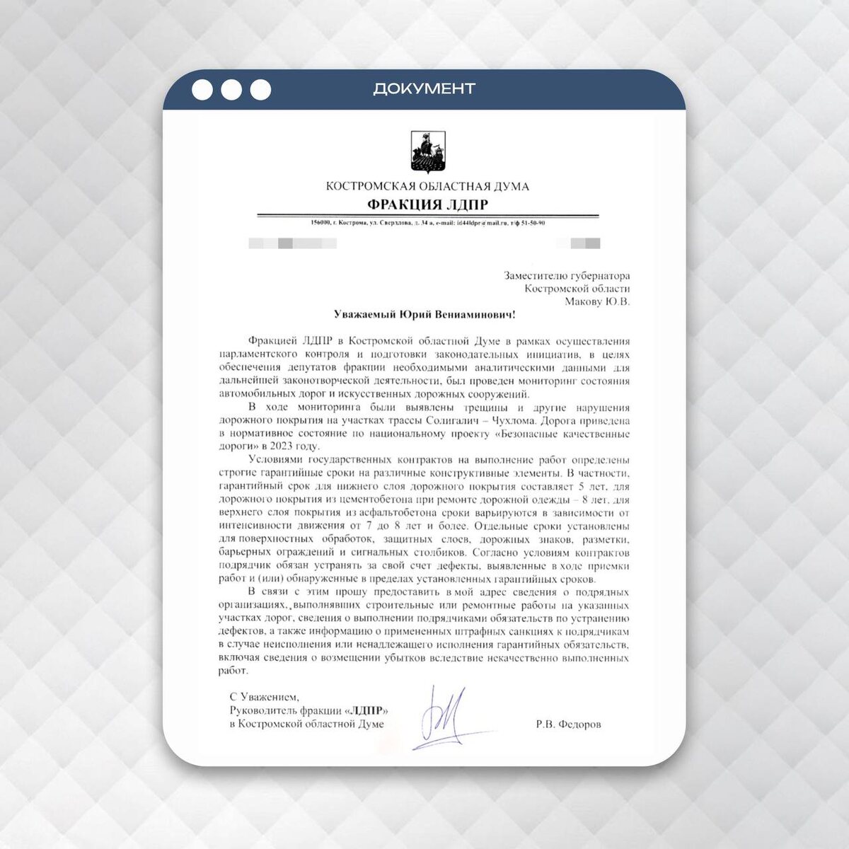 ❗ В Костромское региональное отделение партии обратились встревоженные солигаличане. Люди не могут понять: дорогу между Солигаличем и Чухломой отремонтировали по нацпроекту в 2023 году, она ещё на гарантии, а дорожники на ней уже заливают трещины. 👉🏼 Местные жители задают логичные вопросы: зачем тратить немалые деньги, чтобы спустя короткое время после сдачи латать это же покрытие, вместо того, чтобы ремонтировать другие разбитые трассы? Руководитель ЛДПР в регионе, депутат областной думы Руслан Федоров направил письмо заместителю губернатора Юрию Макову. Парламентарий просит провести мониторинг – как подрядчики соблюдают свои гарантийные обязательства. ✅ Отметим, что сообщить о разбитых дорогах можно на сайте проекта «Буду жаловаться в ЛДПР». Обращения принимаются здесь. ЛДПР Кострома🕊