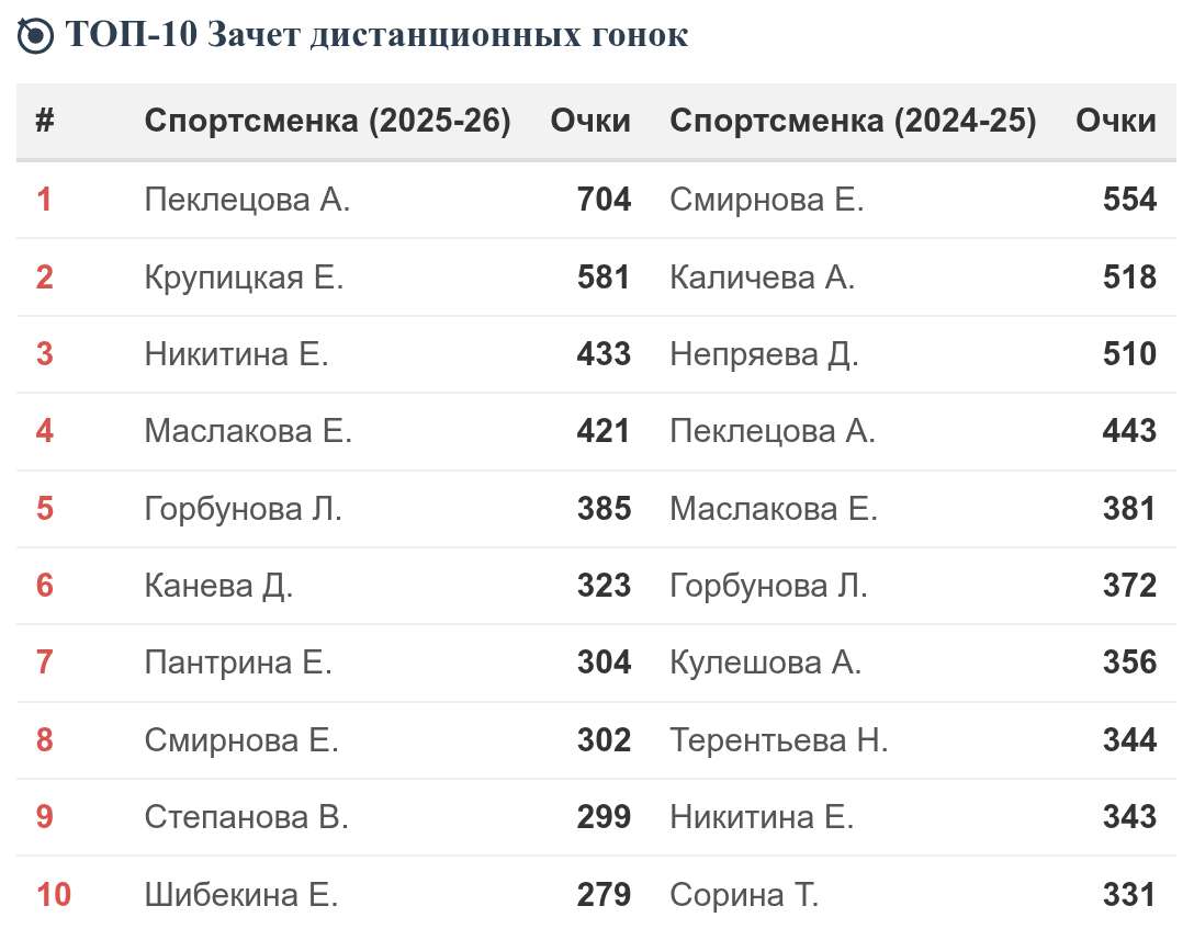 Сезон 2025-2026 подарил нам нового лидера — Алину Пеклецову. Она доказала, что упорный труд и специализация на дистанционных гонках приносят свои плоды. Конкуренция в российском женском лыжном спорте растет, молодые имена (Никитина, Маслакова, Канева, Гончарова и Шорохова) наступают на пятки ветеранам, а возвращение таких звезд, как Терентьева, Степанова и Непряева, делает любую гонку непредсказуемой.