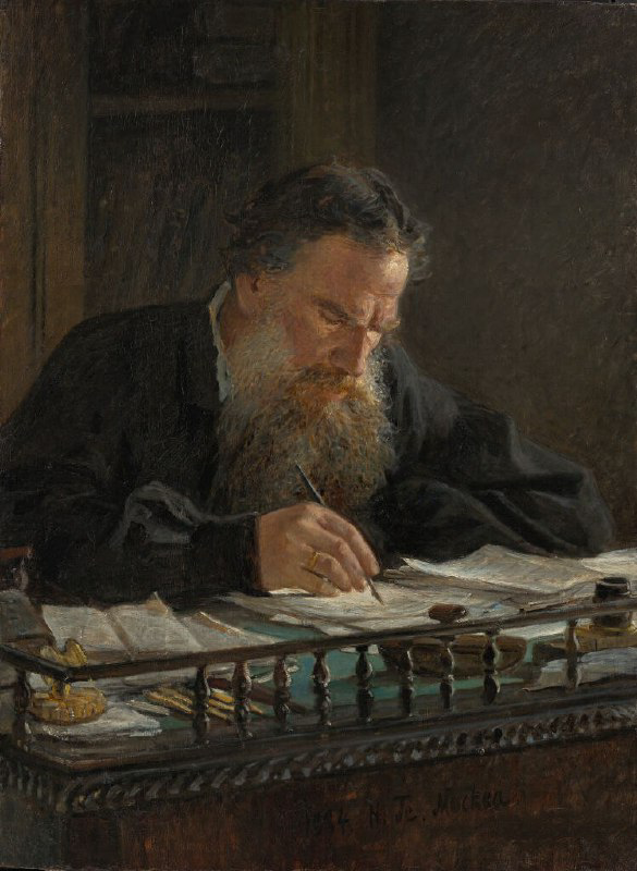 Толстой здесь не обращён к зрителю. Его лицо частично скрыто, взгляд направлен вниз, в текст. В результате центр композиции смещается: внимание переносится с личности как объекта наблюдения на процесс мышления. Это не портрет для узнавания, а портрет как фиксация состояния.