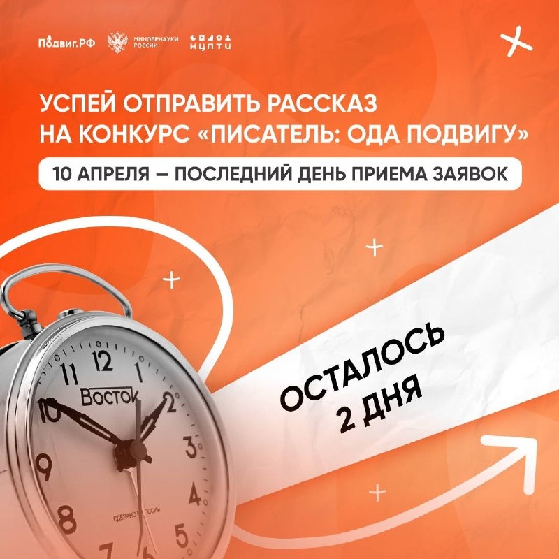 ! Еще есть время рассказать историю о герое, которую мы сохраним на нашей платформе «Подвиг.РФ». Прием заявок заканчивается 10 апреля в 23:59 (по мск). Отправить работу: vk.cc/cVipK8 🧡Подвиг.РФ | Поддержать канал голосом #подвигрф #подвигрф_конкурсы #писатель