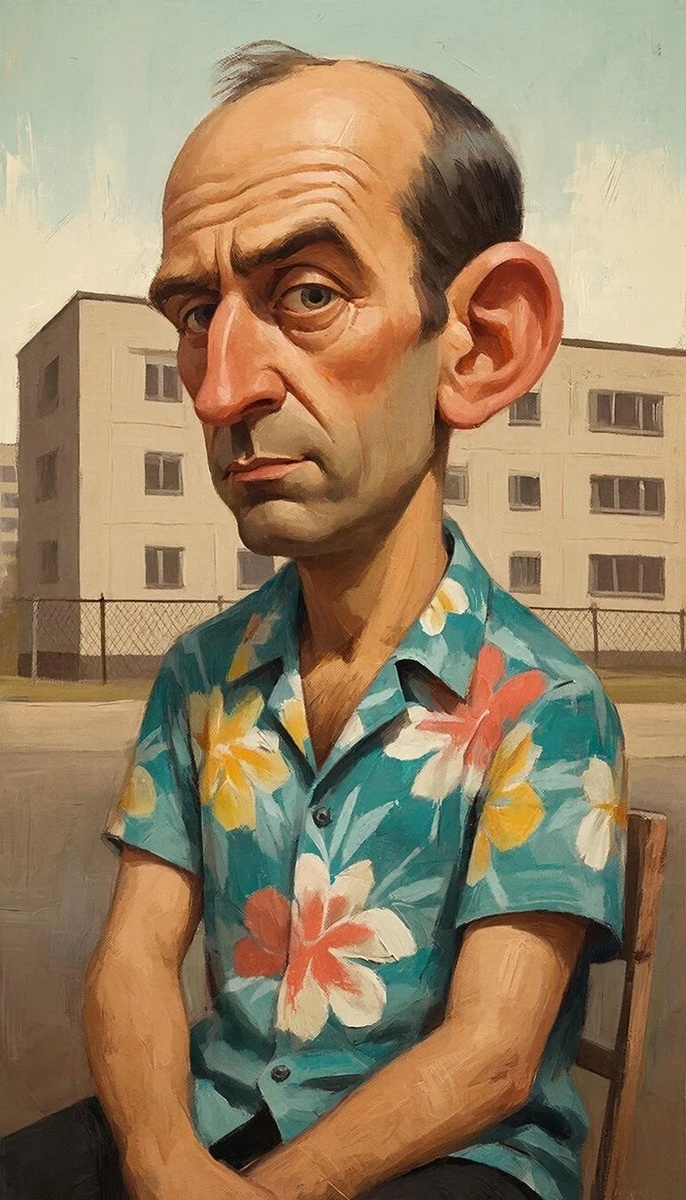 Prompt: A stylized painted illustration of a seated man in front of a mid-20th-century apartment block and a low fence, rendered with warm earthy tones, visible brushstrokes and a slightly caricatural look. The man has broad features and a large ear; instead of a blue-and-white striped tank top he wears a vibrant Hawaiian shirt with a bold hibiscus floral pattern in teal, coral, yellow and white,
