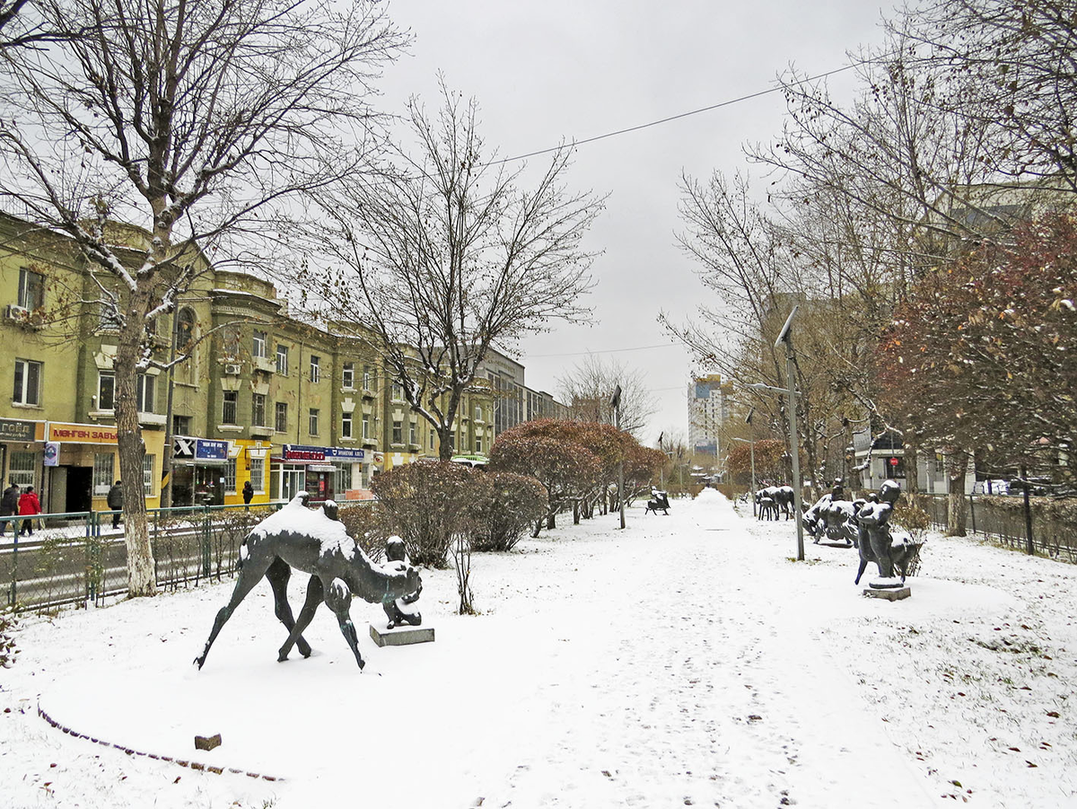 От главной площади Улан-Батора ведёт на запад, к буддийским монастырям, улица Жамсарангийна Самбу - уже не революционера, но одного из ключевых политиков Красной Монголии: в судьбоносные 1937-46 годах - посол в СССР, в 1954-72 - номинальный глава МНР (хотя по факту уже тогда с других должностей ей управлял Цеденбал), а его книга "Советы аратам" (1945) исправно переиздавалась и при капитализме. О чём, видимо, напоминают скульптуры животных на бульваре: Застроенная малоэтажными сталинками и украшенная буддийскими беседками (успевшими порядком обветшать), улица Самбу пересекает небольшую площадь Свободы, сложившуюся в 1970-80-х: Тут мы зря не заглянули за высотку MN-Tower, где скрывается один из лучших в Улан-Баторе кинотеатр "Тэнгис" (1985; до 2003 "Ялалт", то есть "Победа") с барельефами на фасаде. Зато с бульвара отлично виден бывший Музей Ленина (1974-80) с сюжетами революционного эпоса: После распада соцблока здание занимала всякая всячина вплоть до биллиардной, сюрреалистически смот