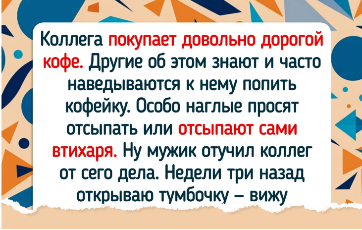 - Коллега покупает довольно дорогой кофе. Другие об этом знают и часто наведываются к нему попить кофейку. Особо наглые просят отсыпать или отсыпают сами втихаря. Ну мужик отучил коллег от сего дела. Недели три назад открываю тумбочку — вижу, стоит банка кофе без каких-либо опознавательных знаков и этикеток.