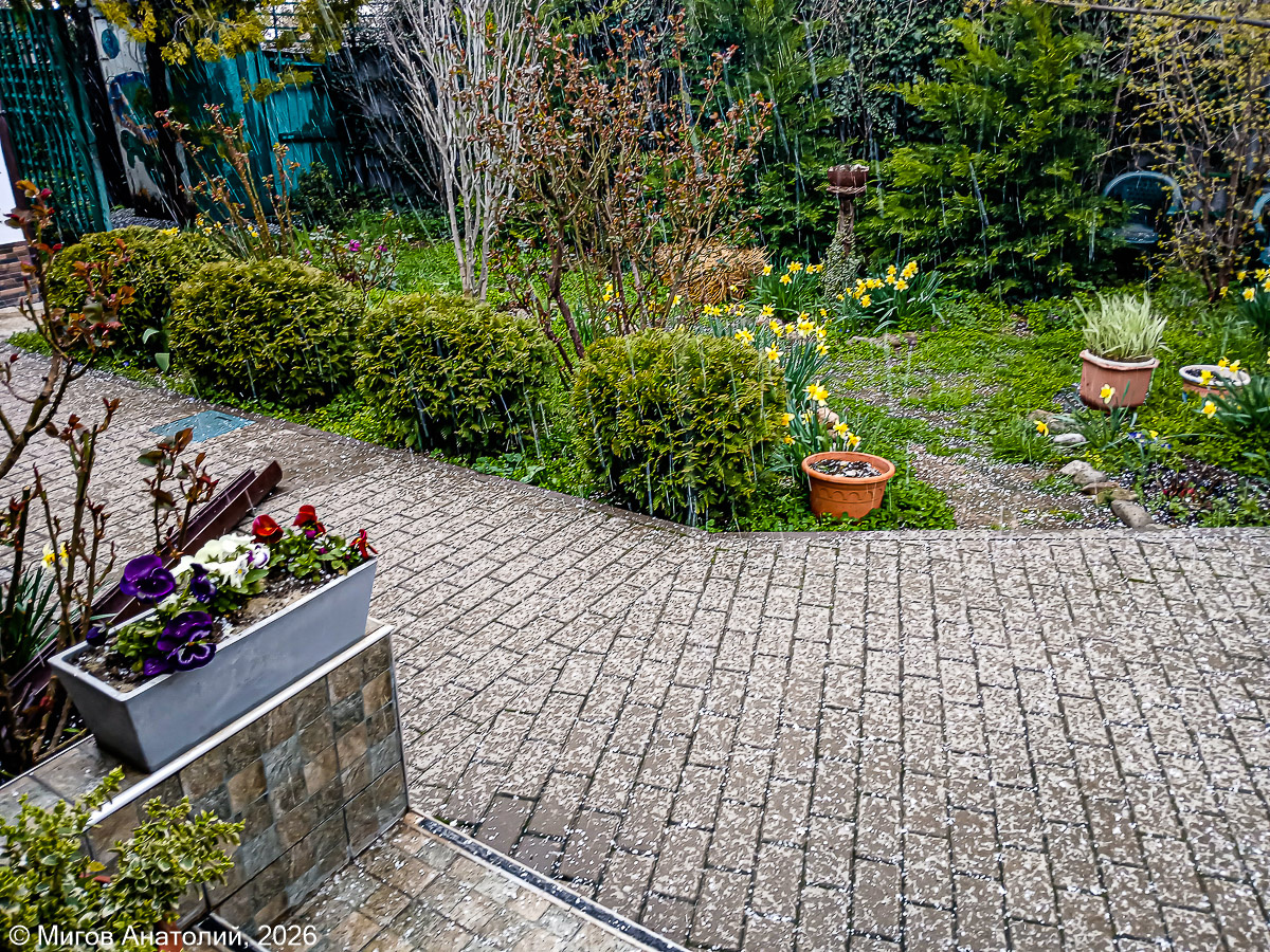 В Крыму весной так часто бывает: дадут летнего тепла, но не успеешь как следует расслабиться, и снова чуть ли не зима. Вот и пару дней назад, с утра у нас все цвело и благоухало, а к вечеру небо помрачнело, и такой холод пришёл, что зубы застучали. Пришлось снова включать отопление. А на следующий день дождь полил. Хороший такой, очень даже желательный для крымской земли. Вот только следом за дождём начал сыпать град. Хорошо ещё, что градины были не крупные. Впрочем, это у нас в Старом Крыму град не сильно злостный, а где-то в Крыму вполне мог быть и более крупного размера. Случалось, что в нашем городке град так себе, а в степи, всего в 20-30 км от Старого Крыма, у машин, стоящих под открытым небом, лобовые стёкла в дырках. Вроде бы, на этот раз подобных сообщений мне не попадалось. Но вот про снег на Ай-Петри, а также на крымских перевалах, СМИ рассказывали. А у нас, хотя град и мелкий, но зато частый. Я вышел на крыльцо, чтобы сделать пару снимков, а за мной наша корги Тильда. Реш