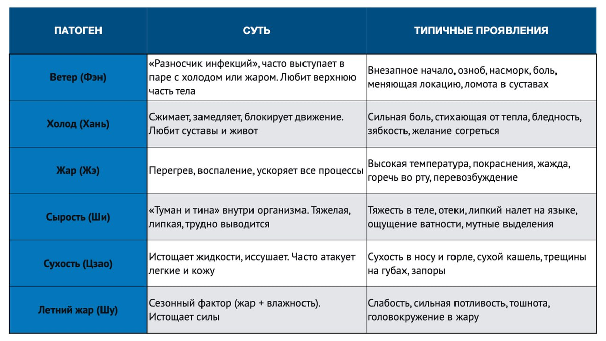 В западной медицине вам скажут: «У вас гастрит» или «У вас аллергия». В традиционной китайской медицине врач скажет иначе: «У вас сырость в селезенке» или «жар в печени». Почему такая разница? Потому что ТКМ не лечит «болезнь по учебнику». Она ищет первопричину - какой внешний фактор нарушил баланс и где именно произошел сбой. Этих факторов шесть, и их называют 6 патогенов. Они приходят извне, когда защитная энергия организма (Ци) ослаблена. Каждый из них оставляет свой «почерк» - набор симптомов, по которым опытный врач определяет стратегию лечения. Подробнее в табличке выше 👆🏼 Вам может показаться, что «Ветер» и «Сырость» - это какие-то поэтические метафоры. Но для врача ТКМ это рабочие инструменты, основанные на тысячелетних наблюдениях. Они описывают не мифические сущности, а реальные закономерности: как именно патоген движется, где задерживается, как меняет состояние тканей и жидкостей организма. Именно эта система позволяет ТКМ эффективно работать там, где западная медицина пор