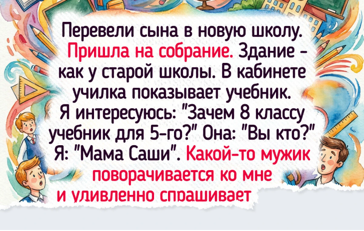 - Перевели сына в новую школу. Пришла на собрание. Здание — как у старой школы. В кабинете училка показывает учебник. Я спрашиваю: «А зачем 8 классу учебник для 5-го?» Она: «Вы кто?» Я: «Мама Саши». Какой-то мужик поворачивается ко мне и удивленно спрашивает: «Вы уверены? Если что я — папа Саши». Выходила из класса под хохот других родителей. На автомате зашла в кабинет, в котором находился прежний класс сына, и тоже шло родительское собрание. © HuzheTatarina