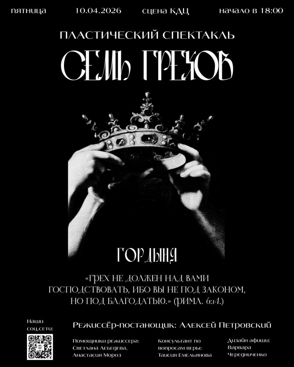 ! 🎭 В пятницу, 10 апреля, в актовом зале КДЦ состоится показ пластического спектакля «Семь Грехов» театральной студии Филиала МГУ «Драма Ломоносова». На этот раз постановка приглашает зрителя к размышлению о том, с чем мы неизбежно сталкиваемся изо дня в день — даже когда остаёмся один на один с собственными мыслями. 📍 КДЦ Филиала МГУ 🗓 10 апреля ⏰ 18:00 📯 Приглашаем студентов, преподавателей, сотрудников, друзей и близких! #объявления_севмгу