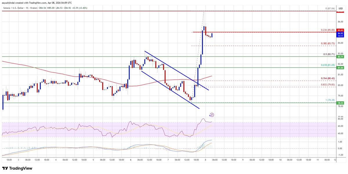 ? Цена: $88 (+5% ↗️) 📈 SOL поднялась выше $82, затем через $85 и сейчас консолидируется около $85. На часовой графике разорвалась быстрая флаг‑паттерн, преодолев сопротивление $80, и даже сломалась область $86.50. Последний пик – $87.04, а ближайшее сопротивление стоит у $88. Пробитие этого уровня может открывать путь к $95 и далее к $102, «приведя» цену к $112. При откате ниже $88 основная защита – $83.75, а дальнейший падение может привести к зонам поддержки $80 и $75. 📊 Ключевые моменты: - Возможный рост выше $88 → потенциальный прирост до $95 и выше - Первая область сопротивления: $85 → $88 - Поддержка: $82.70 → $80, далее до $75 - Технические индикаторы: MACD падает, RSI выше 50 ⚠️ Риски: падение ниже $88 может активировать цепную реакцию и привести к сильному снижению цены до $75.