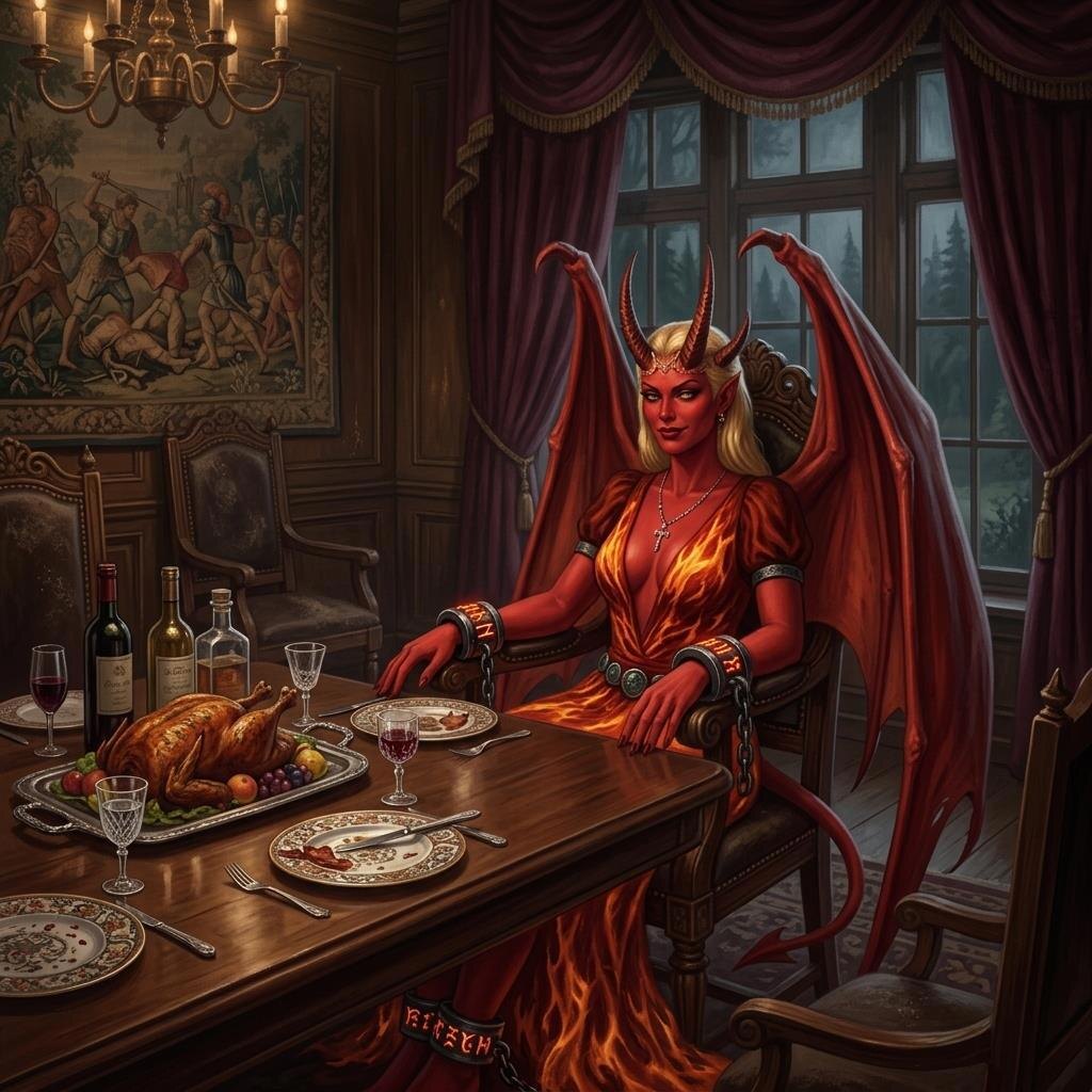 Потом, спустя месяц, меня привели к Вэлдрину. Быстро, надо сказать. А то я уже приготовилась "томиться" в темнице долгие столетия. С меня сняли кандалы ровно настолько, чтобы я могла шевелиться, но при этом не забывала, где моё место. А потом... ужин при свечах. Вино, закуски, закрытые двери, сильный... хозяин, который хочет... поговорить. Звучит как начало неплохого вечера, если бы не одно “но”: ты - закованная в руны демоница, а ужин - допрос. Милый дракон, правда. У него удивительно человеческая привычка верить, что всё решает сила.