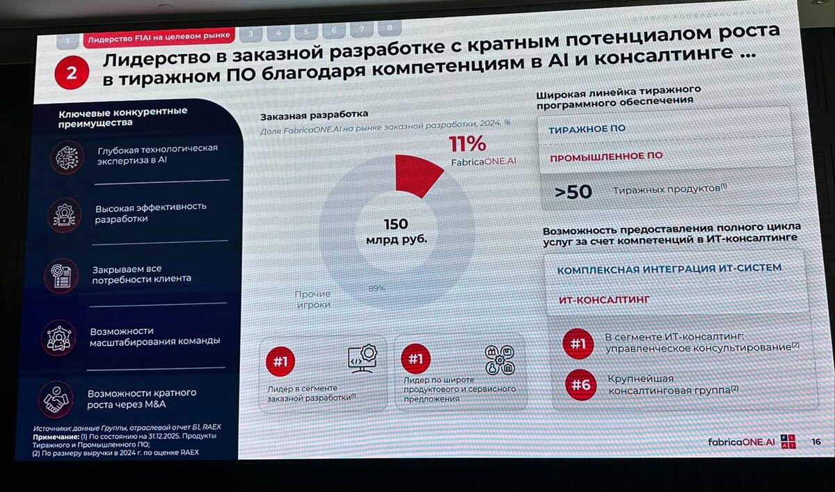 Всем привет 👋🏻 Я сейчас был на закрытом мероприятии FabricaONE AI. Компания заявляет о намерении провести IPO и уже выстраивает коммуникацию с инвесторами через раскрытие результатов и объяснение своей бизнес-модели. Это хороший признак серьезности намерений. Чем занимается компания? FabricaONE AI – компания, которая помогает крупному бизнесу с цифровой трансформацией: от консалтинга и разработки до внедрения, автоматизации и поддержки ИТ-решений. Отдельный акцент компания делает на продуктах и сервисах с использованием ИИ. Про рынок и отрасль Компания работает на рынке цифровой трансформации, который сейчас растет за счет нескольких факторов сразу: импортозамещения, автоматизации, спроса на повышение эффективности и все более активного внедрения ИИ в корпоративные процессы. По материалам компании, ее целевой рынок уже сейчас оценивается примерно в 700 млрд рублей: около 533 млрд рублей приходится на тиражное ПО и еще 164 млрд рублей – на заказную разработку. При этом сам рынок
