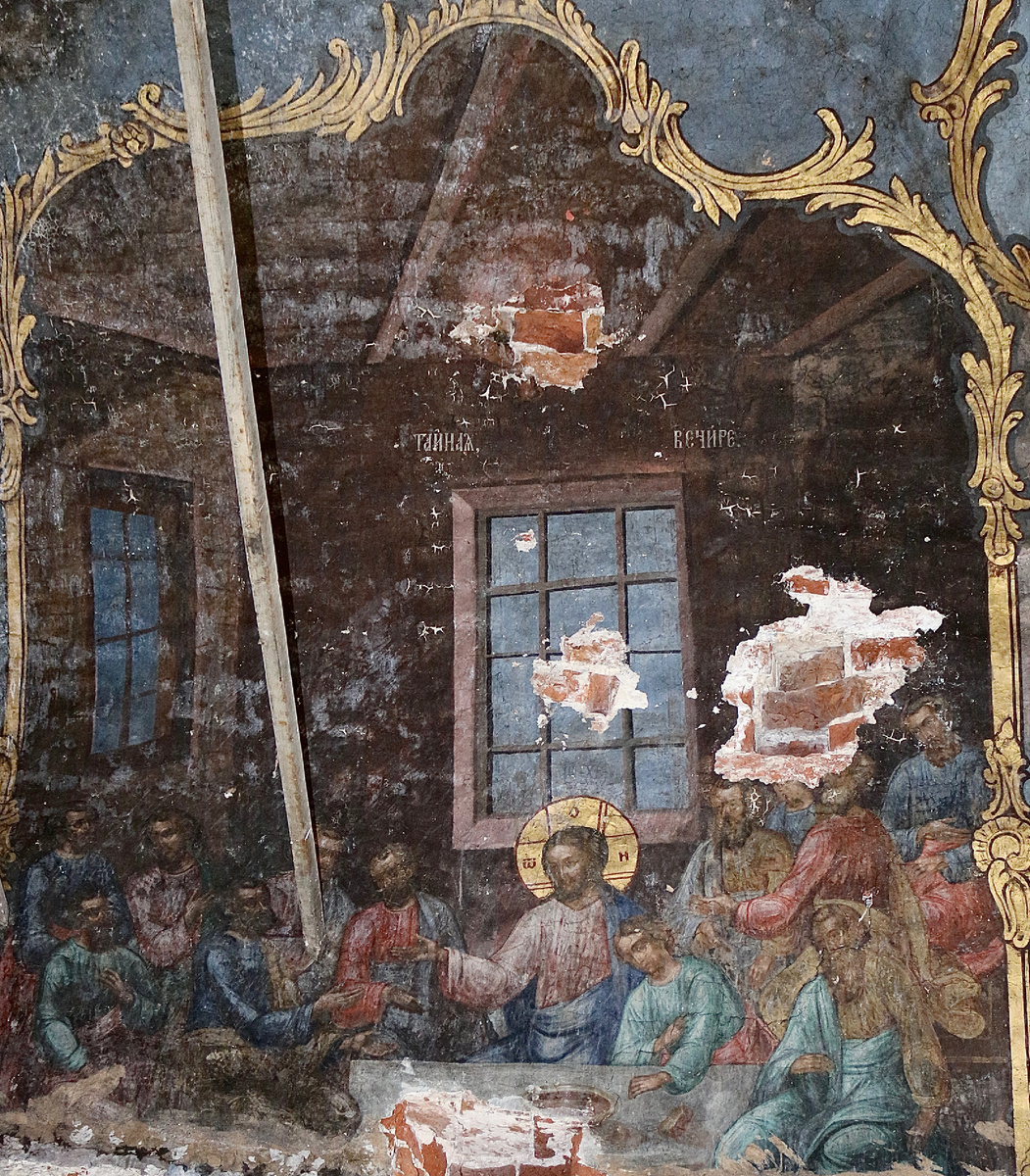 На других изображениях стол подчеркнуто пуст, на нем лишь чаша (чаще в виде кубка) и хлеб. Так живописцы напоминали о важном событии в христианской истории, начало которого было положено за этим ужином - установлении таинства евхаристии (причастия). Невероятно эстетичный образец сохранился на стене церкви Благовещения в селе Княжево.