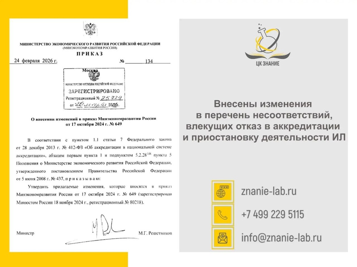 «О внесении изменений в приказ № 649 от 17.10.2024» 📅 Дата вступления в силу: 6 апреля 2026 г. ❗Изменения касаются только АЛ, являющихся федеральными государственными учреждениями, проводящими испытания (исследования) и измерения. ⚡Что изменилось: при расширении ОА и подтверждении компетентности (ПК) не будет отказа в аккредитации и приостановки деятельности таких ИЛ при несоответствии следующим требованиям: 1️⃣ Критерии аккредитации п. 24.2 абзац третий Руководитель лаборатории, его заместители должны работать в лаборатории в штате по основному месту работы. п.24.4 абзац первый - четвертый и шестой, кратко: По месту осуществления деятельности (в т. ч. временных работ) в ОА должны быть: -помещения, оборудование, стандартные образцы (соответствующие законодательству РФ), иные необходимые технические и материальные ресурсы. Условия: - право владения и пользования — не менее 1 года (есть исключения); - для госучреждений достаточно права пользования; -допускается использование уникаль