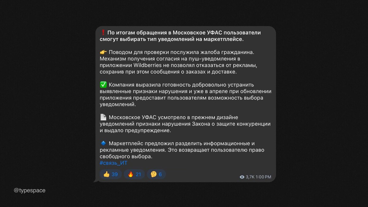 В приложении Wildberries появится разделение push‑уведомлений: рекламные сообщения будут отделены от уведомлений о доставке. Пользователи смогут отключать ненужные уведомления. Изменения связаны с жалобой пользователя в ФАС. Служба выявила нарушение закона «О защите конкуренции» и выдала компании предупреждение. Wildberries самостоятельно предложила разделить push‑уведомления. https://dzen.ru/id/5c0e38ff46ef5c00aaa80527