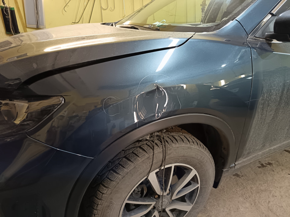 Логика подсказывает, что красить не надо. Вопрос в другом! Как сохранить при выравнивании металла краску?! Жизненный опыт и самостоятельные попытки такого ремонта многих владельцев и экспертов из кузовных автосервисов красноречиво заявляют, что "выправить вмятину и сохранить краску невозможно" … Тут, как говорится "Кто на что учился." Мы с успехом выправляем вмятины на машинах с сохранением краски. Вот один из примеров такой работы. Вмятина получена от удара воротами по крылу. Вмятина на крыле Ниссан удалена у нас за 2,5 часа. Выправили металл через снятый подкрылок. Расправил складки снаружи. Отполировали крыло Результат на фото Крыло выправлено, краска сохранена родная. На все вопросы по ремонту с удовольстви