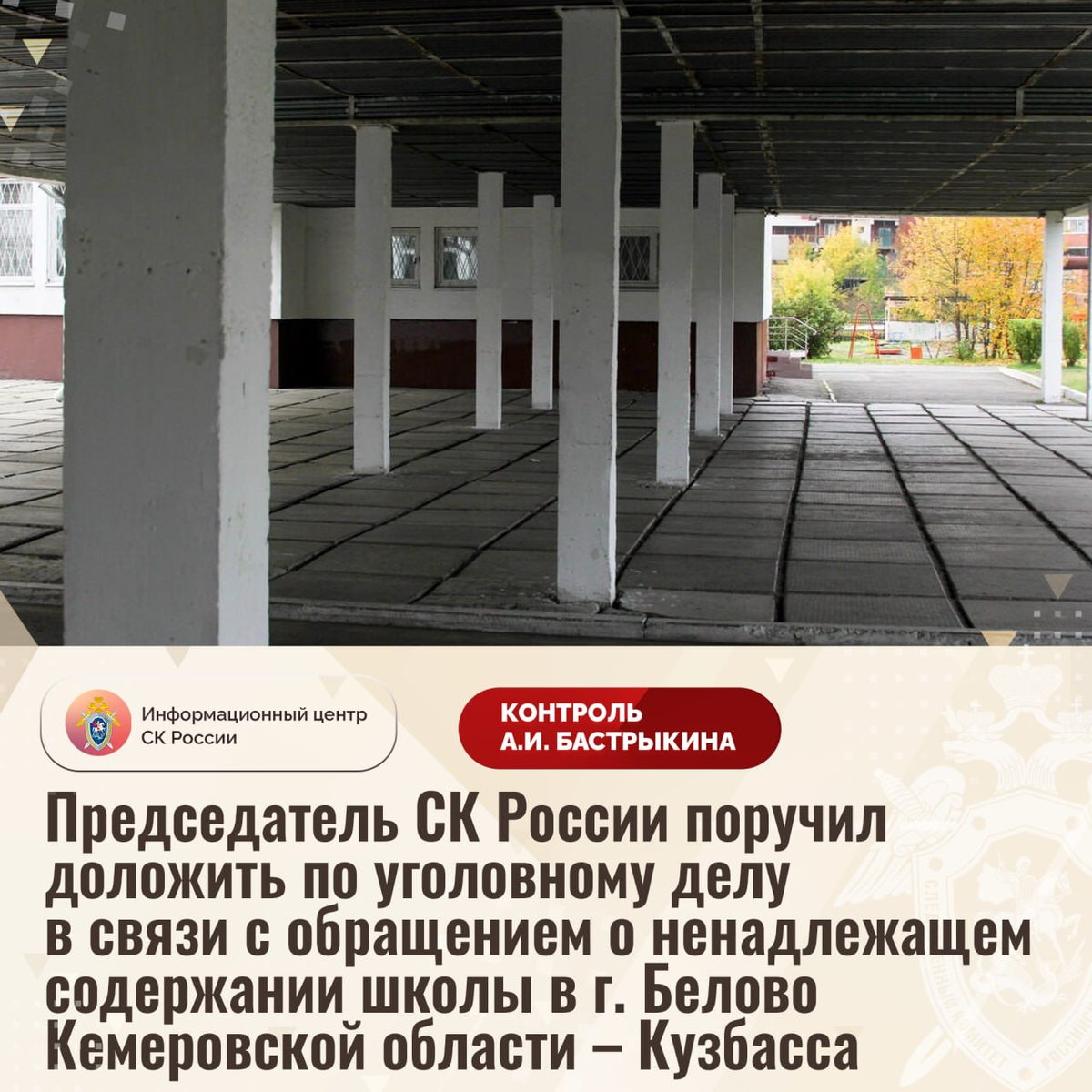 Председатель СК России поручил доложить по уголовному делу в связи с обращением о ненадлежащем содержании школы в г. Белово Кемеровской области – Кузбасса В Информационный центр СК России поступило обращение о ненадлежащем содержании одного из образовательных учреждений в городе Белово Кемеровской области – Кузбасса. Длительное время здание 1962 года постройки находится в непригодном состоянии: фасад разрушается, в стенах образовались трещины, кровля деформирована. В декабре прошлого года в одном из кабинетов обрушились потолочные конструкции. Отмечается, что на протяжении 25 лет ремонт образовательного учреждения не проводился. Мер к устранению нарушений не принимается, дети вынуждены обучаться в небезопасных условиях. В СУ СК России по Кемеровской области – Кузбассу с декабря прошлого года расследуется уголовное дело, возбужденное по поручению А.И. Бастрыкина. Председатель Следственного комитета Российской Федерации Александр Иванович Бастрыкин поручил и.о. руководителя СУ СК России