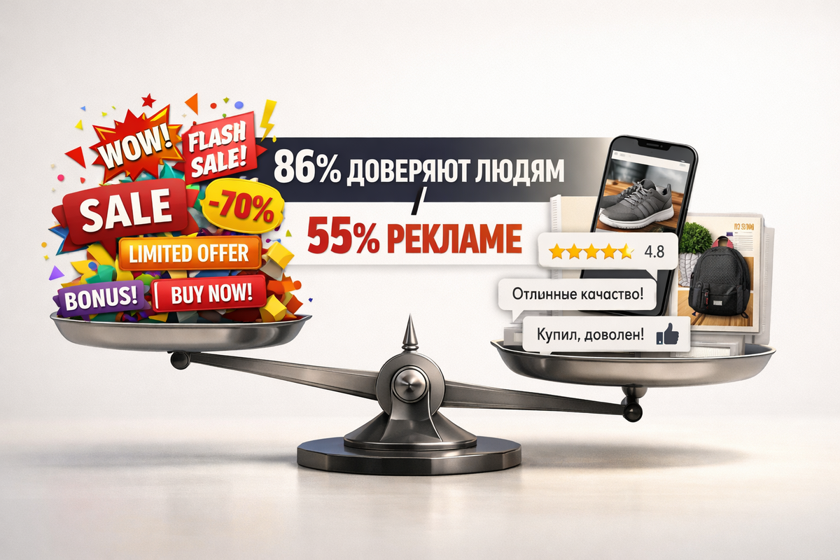 86% россиян доверяют рекомендациям знакомых. Отзывам в интернете — 73%. А прямой рекламе? Всего 55%. Данные Nielsen, 56 рынков. То есть больше половины людей совершают покупки на маркетплейсах не потому, что увидели рекламу — а потому что кто-то посоветовал или отзывы убедили. И вот вопрос: если вы знаете эту статистику — почему продолжаете делать ставку только на рекламу? Особенно если вы сами — покупатель на том же маркетплейсе, где продаёте. Вспомните, как вы последний раз что-то заказывали на Wildberries или Ozon. Закинули несколько товаров в корзину — чтобы не потерять. Потом начали сравнивать: смотрели не на рекламу, а на цену, отзывы и особенно на фото от реальных покупателей — как вещь выглядит без студийной съёмки и фотошопа. Проверили сроки доставки. Нажали «Оплатить». Товар приехал — примерили, потрогали, оценили. И только тогда приняли финальное решение: оставить или вернуть. Вот такой путь проходит каждый покупатель на маркетплейсе. Каждый день. С каждым товаром. И вы тож