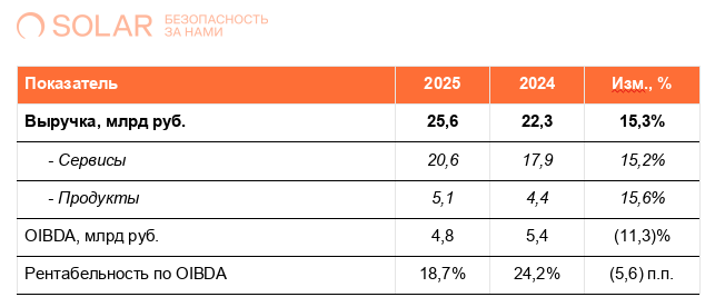 Выручка ГК «Солар» в 2025 году увеличилась на 15,3% год к году до 25,6 млрд рублей в основном за счет увеличения количества клиентов Группы, развития партнерской сети и расширения портфеля востребованных продуктов, сервисов и услуг.