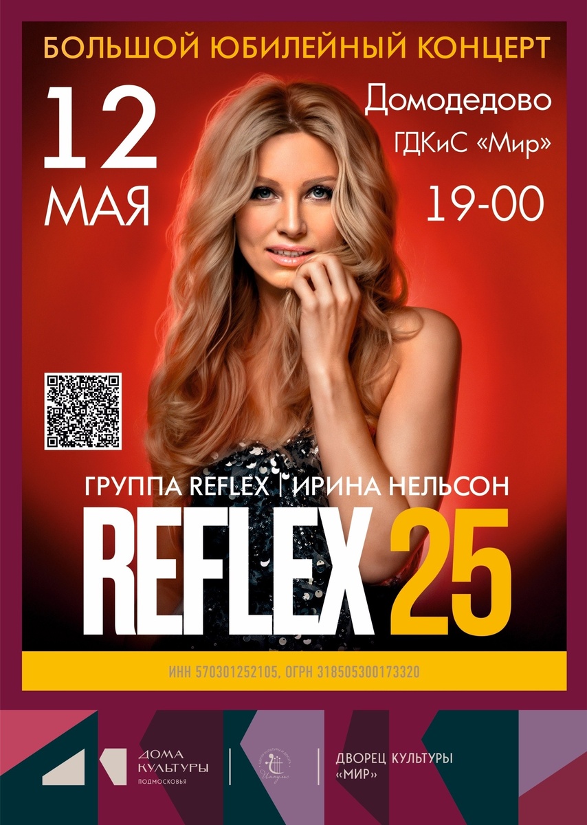 ✨ Юбилейный концерт группы «Reflex»🎤 🎶 Большой сольный концерт культовой группы 2000-х — REFLEX! Бессменная солистка Ирина Нельсон, чей голос невозможно перепутать ни с кем, вновь порадует зрителей Домодедова. Это 2 часа музыки, под которые выросло целое поколение. 🎶 В программе легендарные хиты, которые знает наизусть вся страна: «Сойти с ума», «Нон-стоп», «Люблю», «Танцы», «Потому что не было тебя», «Первый раз» и, конечно, новые песни. 📆 12.05.2026🕒19:00 🏢 Дворец культуры и спорта «Мир» 📍 г. Домодедово, Каширское шоссе, д.100А ✅ Мероприятия Домодедово https://dzen.ru/id/66f10385cc4c5a16f7b5fb02 https://vk.ru/domodedovo_events http://dzen.ru/domodedovo_events