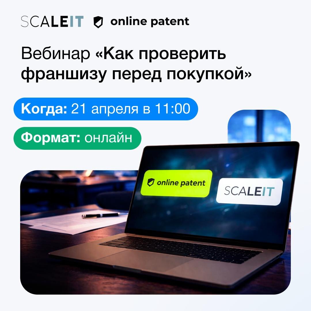 Покупка франшизы — это инвестиция, которая требует такой же проверки, как и любой другой актив. Как убедиться, что бренд действительно принадлежит франчайзеру? На что смотреть в договоре, чтобы не пропустить риски? Как понять, что бизнес-модель работает не только в презентации? Эти и другие вопросы разберут эксперты двух компаний на открытом вебинаре 21 апреля в 11:00. Мероприятие пройдёт в партнерстве платформы цифровых сделок по франчайзингу SCALE IT и патентного бюро «Онлайн Патент», которые недавно заключили официальное соглашение о сотрудничестве. Программа вебинара: Анна Чернецова, руководитель направления зарубежного патентования «Онлайн Патент», расскажет: 💬почему франшиза без товарного знака — это фикция; 💬как через открытые реестры проверить, кому на самом деле принадлежит бренд; 💬какие подводные камни скрываются в документах франчайзера. Мария Кизима, сооснователь и генеральный директор SCALE IT, поделится: 💬цифровыми инструментами для оценки эффективности франшиз