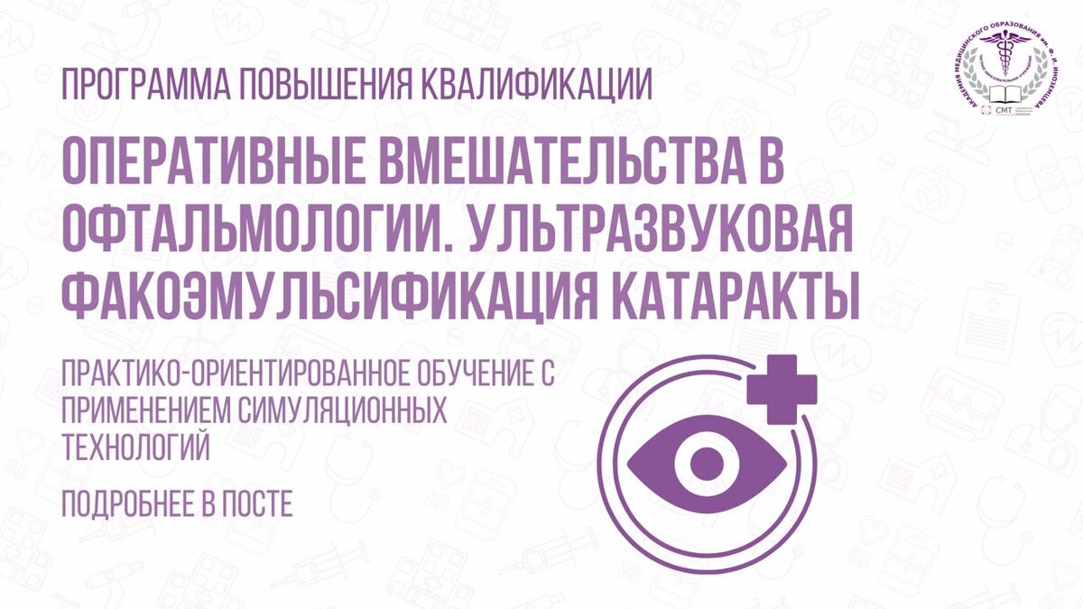 Особое место здесь занимает медицинская сестра, от которой напрямую зависит безопасность пациента и эффективность вмешательства. Академия медицинского образования им. Ф. И. Иноземцева приглашает на программу повышения квалификации: «Оперативные вмешательства в офтальмологии. Ультразвуковая факоэмульсификация катаракты» 📚 Практико-ориентированное обучение с применением симуляционных технологий 🔬 Что вы освоите: • подготовку операционной, оборудования и инструментов • алгоритмы работы при факоэмульсификации катаракты • обеспечение инфекционной безопасности и стерильности • сопровождение пациента на всех этапах оперативного вмешательства • работу с современными интраокулярными линзами и оборудованием • действия при интраоперационных осложнениях Программа направлена на формирование ключевых профессиональных компетенций операционной медицинской сестры и совершенствование практических навыков 🩺 Практика, а не теория Обучение включает: • симуляционные модули • отработку реальных а