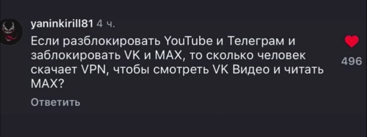 Если разблокировать YouTube и Телеграм, а заблокировать VK и MAX - сколько человек скачает VPN, чтобы смотреть VK Видео и читать MAX?