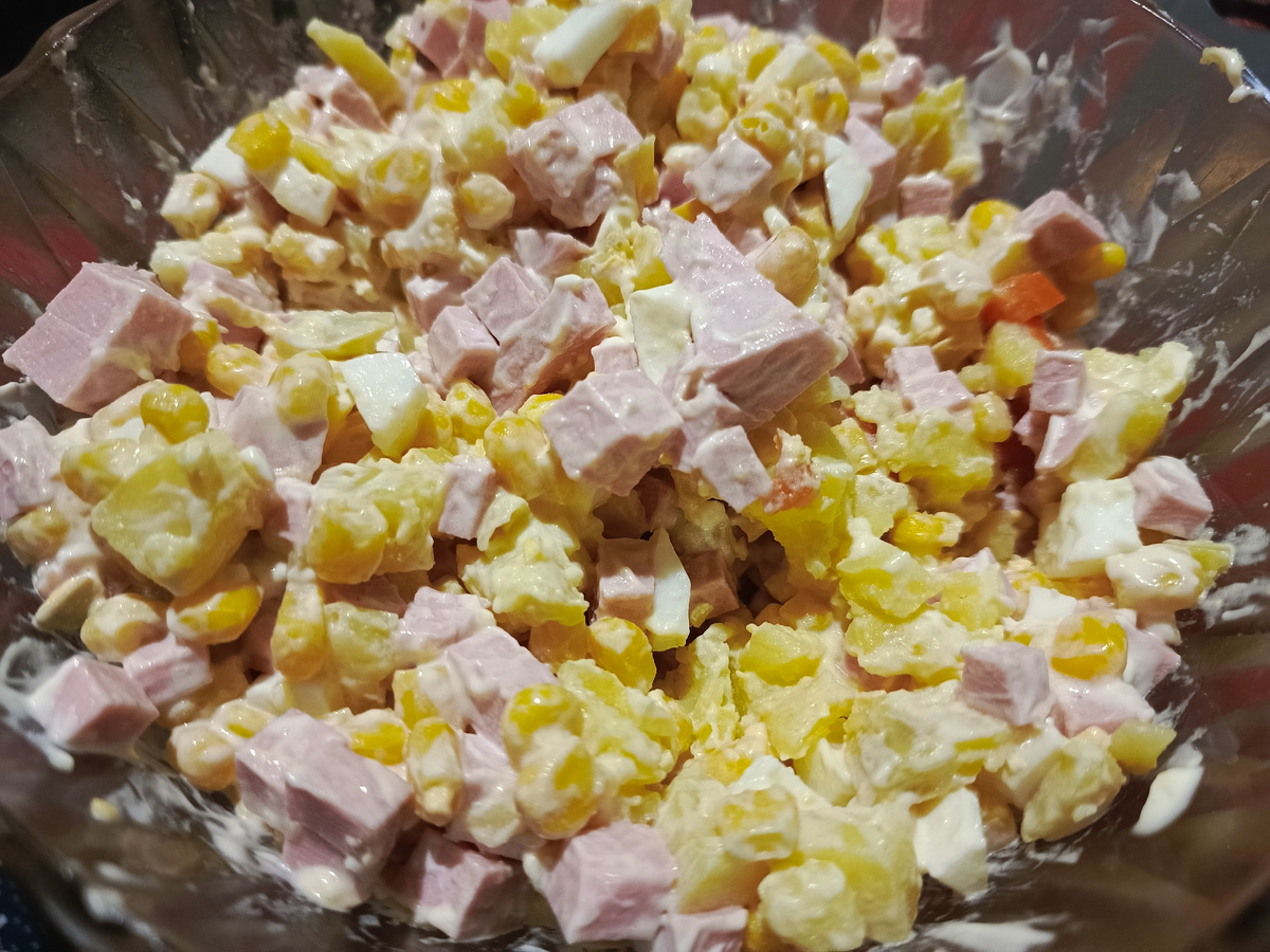 Вареные яйца, морковь и картофель нарезаем кубиками. Отправляем в салатник. Туда же добавляем ветчину, также порезанную кубиками. Добавляем кукурузу, немного зеленого или репчатого лукк и майонез. Все перемешиваем.