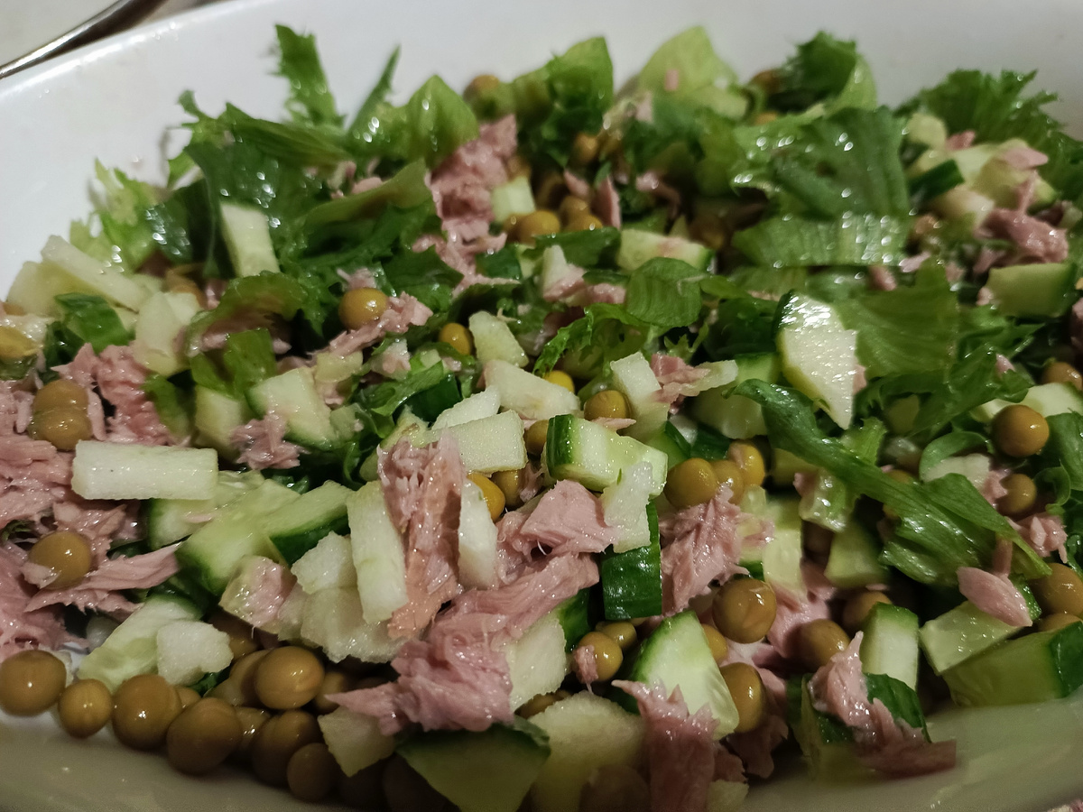 В салатник выкладываем листья салата, консервированный горошек, тунец консервированный, а также зеленое яблоко без кужуры и огурец, нарезанные кубиками. Заправляем салат оливковым маслом, можно добавить немного горчицы.
