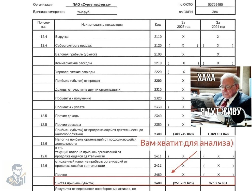 Начали возвращаться на интересные уровни Недавно компания представила «очень богатый отчёт» за 2025 год. Можете увидеть на картинке выше. Убыток за прошлый год составил 251 млрд ₽, против прибыли 0,9 трлн ₽ в 2024 году . Ничего неожиданного. Ожидаемо получили негативную валютную переоценку на фоне укрепления рубля в 2025 году: Курс USD/RUB на 31.12.2024 — 101,7 ₽ Курс USD/RUB на 31.12.2025 — 78,22 ₽ То есть укрепление на 23% . 💸 Дивиденды По обыкновенным и привилегированным акциям составят 0,9–1 ₽ . В начале марта, когда цена префов была 47 ₽, я предупреждал, что Сургутнефтегаз стоит недешево и интереса особого нет. С того момента акции скорректировались почти на 20% в моменте, и текущие уровни вновь становятся интересными для рассмотрения . 📈 Что дальше? Если на конец года курс $ будет 80–85 ₽, дивиденд может составить 11–16%. При курсе выше 90 ₽, дивидендная доходность будет >20% . То есть даже при небольшой девальвации получаем неплохую форвардную дивидендную доходность