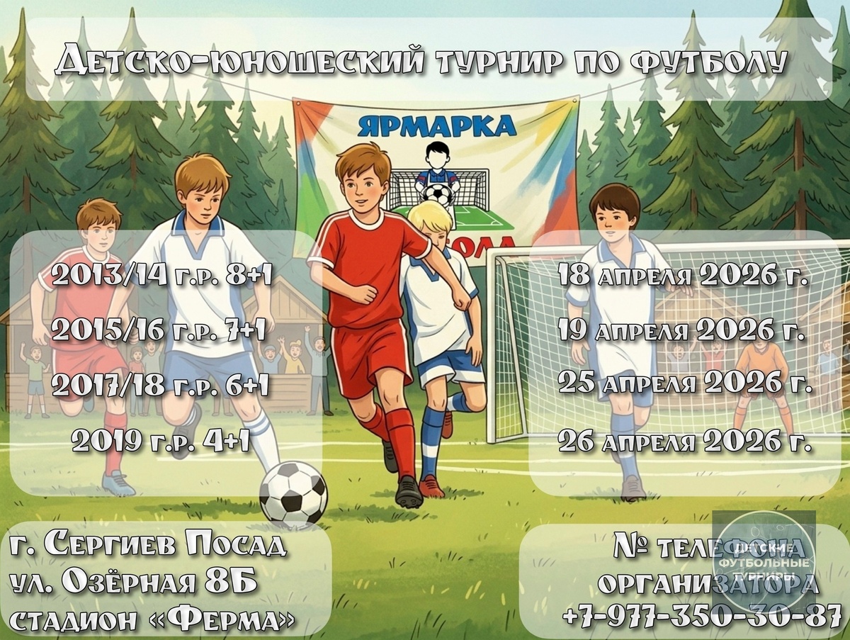 » 🏟 г. Сергиев Посад , стадион «Ферма» 👨🎓Квалифицированное судейство; 👨⚕Дипломированный медицинский сотрудник; 🏆Кубки, медали и крутые подарки для призёров; 🔊Живая атмосфера, музыка, поддержка; 📸 Эстетичные фото и видео (будет что сохранить в архив); 📽 Видеотрансляции матчей; 🎙 Ведущий-комментатор; 🎯 Конкурсы и активности для ВСЕХ участников турнира. Подробности 89773503087 Давид -— #ФутбольныйТурнирАпрель2026 #ФутбольныйТурнирМосковскаяОбласть2026 #ФутбольныйТурнирСергиевПосад2026 #ФутбольныйТурнирМосковскаяОбласть2013гр #ФутбольныйТурнирМосковскаяОбласть2014гр #ФутбольныйТурнирМосковскаяОбласть2015гр #ФутбольныйТурнирМосковскаяОбласть2016гр #ФутбольныйТурнирМосковскаяОбласть2017гр #ФутбольныйТурнирМосковскаяОбласть2018гр #ФутбольныйТурнирМосковскаяОбласть2019гр Источник: https://vk.com/wall-178222694_2746