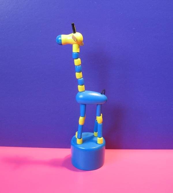 Необычность и привлекательность игрушки состоит в том, что, если незаметно нажать большим пальцем на круглую пластину в основании, натяжение нити ослабляется, сжатые бусины освобождаются, и фигурка жирафа опадает, а убрав палец с пластины пружины можно его можно опять «оживить» и привести в устойчивое состояние.