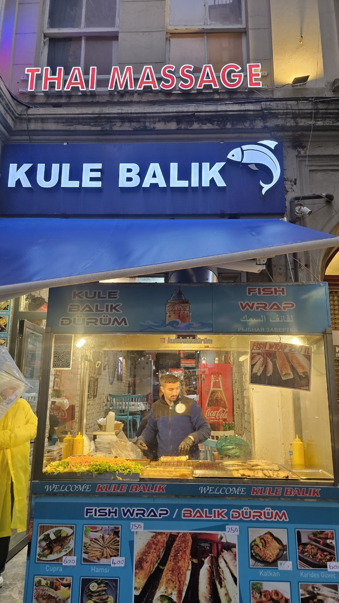Добрый день, Многие фудблогеры рекомендуют поесть в Стамбуле Балык-экмек (Balık Ekmek) или Балык дюрюм (balık dürüm). По определению ИИ Балык-экмек (Balık Ekmek) — это самый известный уличный рыбный сэндвич в Турции, название которого буквально переводится как «рыба-хлеб». Традиционно это жареная на гриле скумбрию с салатом, луком и лимоном в свежем хлебе, ставший гастрономическим символом Стамбула, особенно района Эминёню. Балык дюрюм (balık dürüm) — популярная турецкая уличная еда, представляющая собой филе жареной на гриле скумбрии, завернутое в тонкий лаваш с овощами (луком, зеленью, помидорами) и лимонным соком. Это сочный и быстрый перекус, который часто называют «рыбой в лаваше», отличающийся от «балык экмек» (в хлебе) способом подачи. Мы его пробовали у Гаталатской башни в Kule balık dürüm Мне очень понравилось. Ниже фотографии того, как выглядит заведение, ингредиенты и то, что получилось.