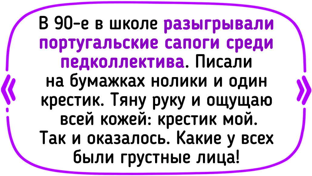 В 90-е в школе разыгрывали португальские сапоги среди педколлектива. Писали на бумажках нолики и один крестик. Тяну руку и ощущаю всей кожей: крестик мой. Так и оказалось. Какие у всех были грустные лица! © Эльвира Богачева / Dzen История от мамы про её беспечность. Все 5 лет учёбы в институте мама была старостой группы. Одной из её обязанностей было получение стипендии на всю группу и раздача её по ведомости студентам. Однажды, получив стипендию на всю группу, она забежала в общагу, положила сумку с денежками в комнате и побежала по магазинам. Когда вернулась, в соседней комнате ревут девчонки, которых обокрали, пробравшись в комнату через балкон (2 этаж). Сидит, утешая их, и вдруг — мысль, как молния: у меня же сумка с деньгами в комнате лежит! На ватных ногах заходит к себе — сумка с деньгами лежит на кровати. А в ней около 1000 советскими! Маме повезло: 1) что вор сначала влез в соседнюю комнату; 2) наверное, пройти в другую, мамину, ему помешали стоявшие на общем балконе секции ра