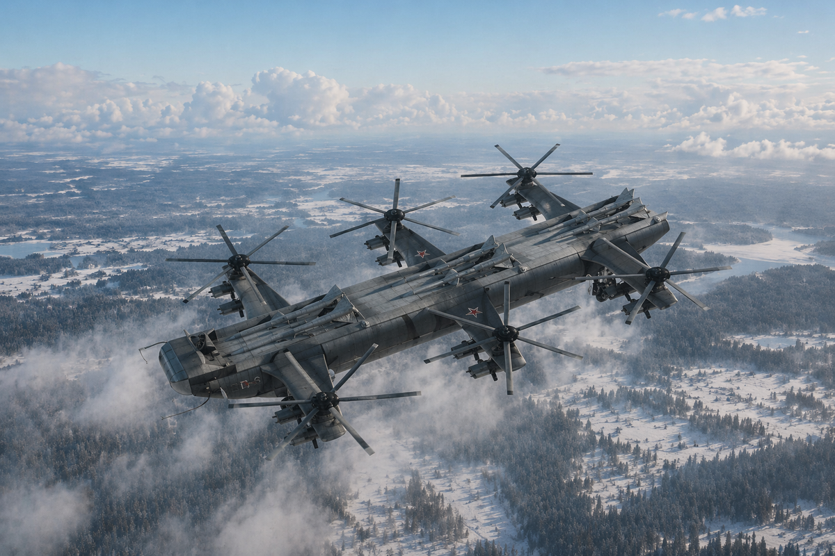 Эскизы этой машины до сих пор выглядят как кадр из советской научной фантастики. Шесть роторов. Двадцать четыре двигателя. Почти пятьдесят метров в длину. И под брюхом — не грузовой отсек, а полноценная батарея зенитных ракетных комплексов С-75, готовых к пуску прямо из воздуха.