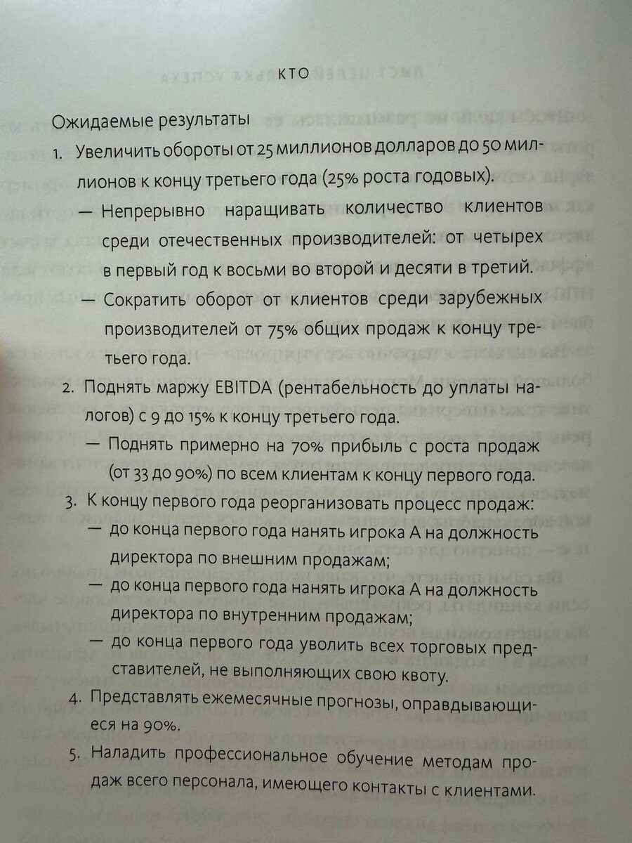Я сейчас читаю книгу «Кто» (очень рекомендую). И сделала скрин, который хочу вам показать. Это реальные цели для президента по продажам в крупной компании. Смотрите, что ему поставили: 📈 Увеличить годовой оборот с 25 млн $ до 50 млн $ к концу третьего года. 📈 Обеспечить рост 25% годовых. 📈 Поднять маржу EBITDA Никаких «наладить процессы», «улучшить коммуникацию», «повысить лояльность». Конкретные цифры. Конкретные сроки. Конкретный результат. И вот о чём это говорит. Любой ключевой сотрудник - это не статья затрат. Это статья инвестиций. Вы не просто «платите зарплату». Вы вкладываете деньги в человека, который должен принести компании кратно больше. В 2, 3, 5, 10 раз. И если вы нанимаете топ-менеджера, но не ставите ему измеримых целей по росту, прибыли, маржинальности - вы не нанимаете инвестора в ваш бизнес. Вы нанимаете дорогого исполнителя. Который будет делать «процессы», а не «результаты». А разница колоссальная. Не нанимайте универсалов, нанимайте специалистов.