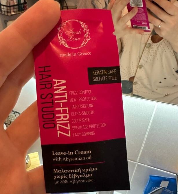 Природа (и гены от папы Гены) наградила меня тонкими, быстросохнущими волосами, которые при естественной сушки после душа становятся красивыми локонами. Но, как и прямоволосые хотят кудряшек, я хочу иногда быть с прямыми волосами и делать себе укладку. Недавно покупала любимые вкусные лосьоны для тела греческой марки Fresh line и в подарок дали пробников (в рив гош всегда так делают). Попалось мне в этот раз несмываемое средство Anti-frizz для укладки с термозащитой.