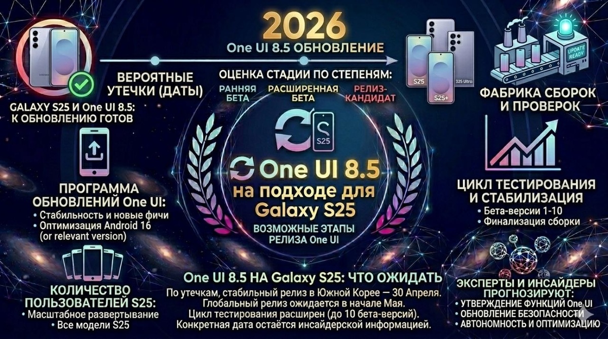 По новым утечкам, Samsung может выпустить стабильную версию One UI 8.5 для линейки Galaxy S25 уже 30 апреля в Южной Корее. Глобальный релиз, если всё пойдёт по плану, уже в начале мая. Интересно, что цикл тестирования оказался заметно длиннее обычного — обсуждается до 10 бета-сборок перед финалом. При этом компания уже расширила бета-программу на другие смарты, что подтверждает скорый релиз. Впрочем, конкретная дата пока что остаётся на уровне инсайдов. Но если утечка подтвердится, владельцы Galaxy S25 наконец получат стабильную прошивку после затянувшегося ожидания. 🤩 PRO: история продолжается