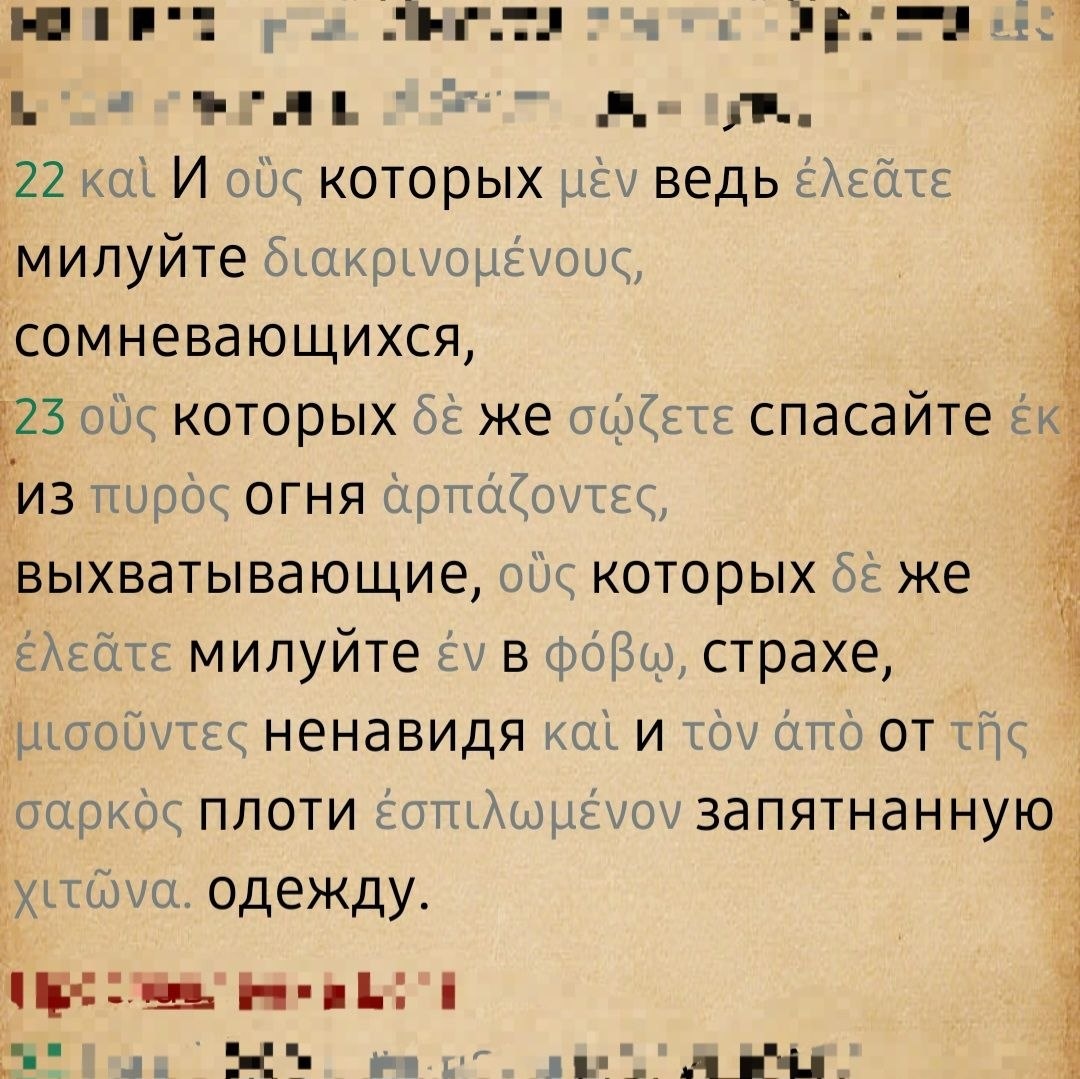 ШОК КОНТЕНТ Иуд 1:22-23: "И к одним будьте милостивы, с рассмотрением; а других страхом спасайте, исторгая из огня, обличайте же со страхом, гнушаясь даже одеждою, которая осквернена плотию." Сколько я видел людей отлученных, духовно покалеченных и отвергнутых с формулировкой "иных страхом спасайте". Но знаете что? В Библии этого нет) Первое фото. Это оригинальный греческий текст с пословным переводом. " Милуйте сомневающихся. Спасайте, выхватывайте как и огня (например: не медлите, действуйте быстро). Когда обличаете, то будьте осторожны, чтобы самим не стать тем, что вы обличаете" Второе фото. Структура текста. Взаимоотношение слов в предложении. Видно, что, обращаясь к читателю, Иуда говорит три тезиса: - милуйте сомневающихся - спасайте, похищая из огня - сострадайте в страхе Страх должен испытывать не тот, кого вы спасаете, а вы. И то страх определенного рода. Вот так... "А как же вас ещё спасать, если не страхом?" - спросит пытливый читатель, поглаживая набор юного инквиз