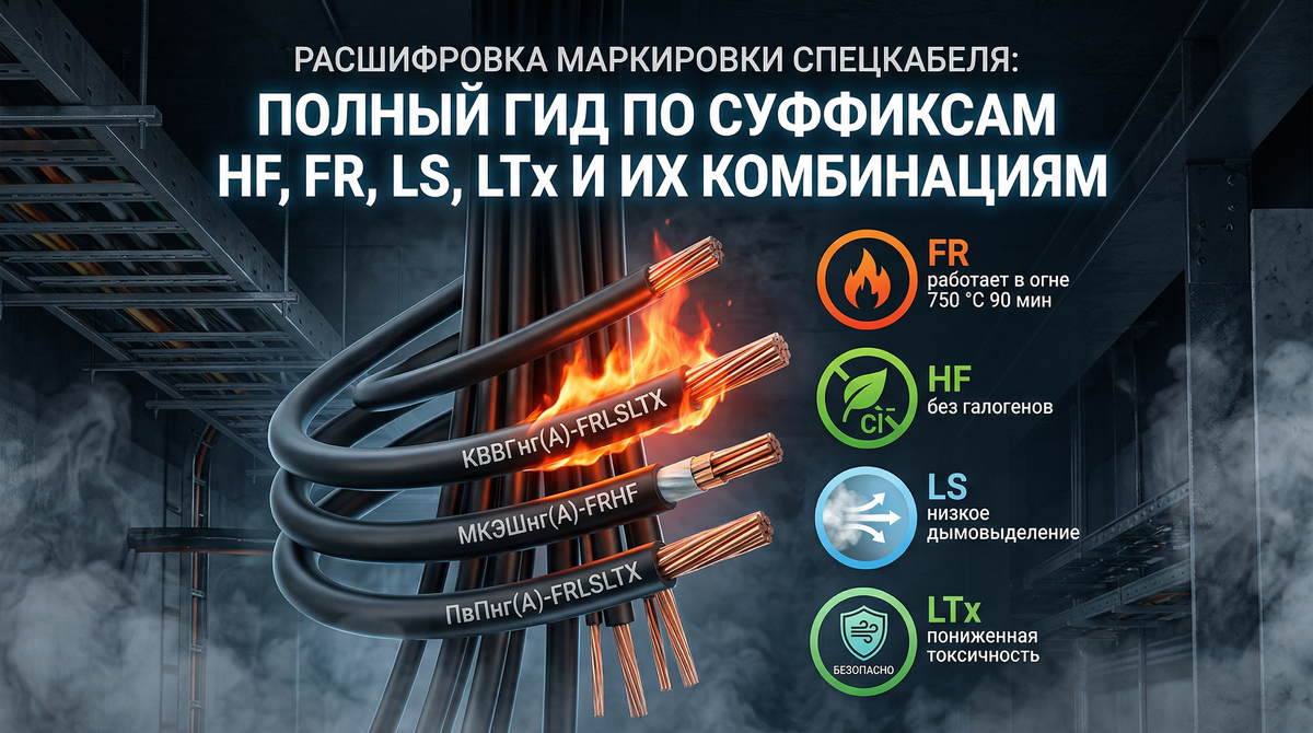 Вывод: суффиксы по смыслу универсальны — их расшифровка одинакова при совместимой базовой марке. База (ВВГ/ПвП/КВВГ…) должна физически позволять заявленные HF/FR/LS/LTx; несостыковка «ПВХ-ВВГ + безгалогенный комплект суффиксов» — повод перепроверить марку и ТУ.