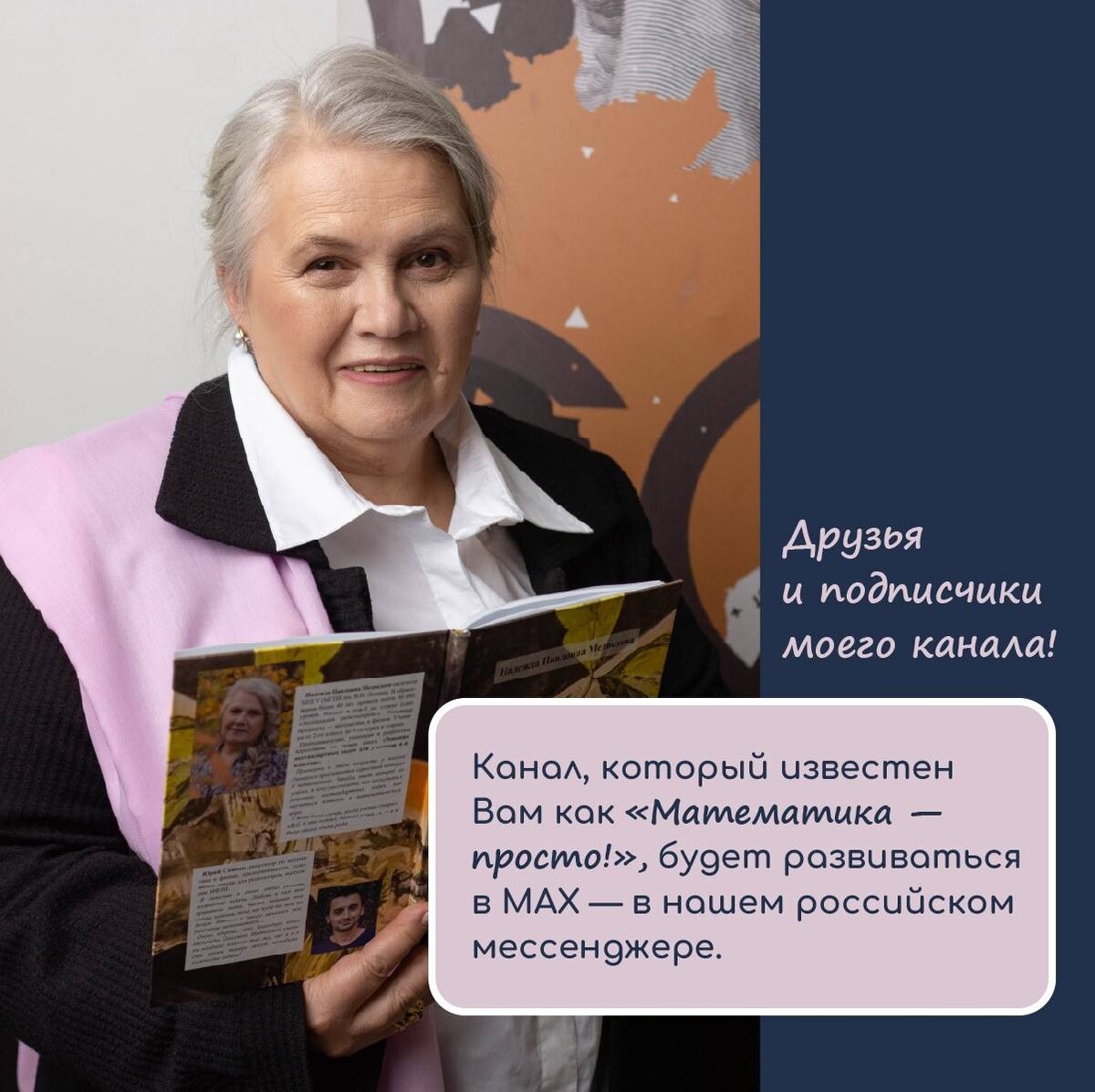 ! 👋 Канал, который известен Вам как «Математика — просто!», будет развиваться в MAX — в нашем российском мессенджере. 🇷🇺 Кто-то ворчит, кто-то сердится, что там какие-то сложности... Я не встретила никаких сложностей при регистрации в MAXе. Дождалась, когда появится возможность, и получила — теперь и маленькие каналы здесь создавать можно. ✅ Переносить — нет, но создавать — конечно, пожалуйста. Да, не все возможности, что были в Telegram, здесь сейчас есть. Но, по словам техподдержки, постепенно всё, что можно было делать в Telegram, здесь тоже будет. 📱 Пока Вы можете оставить реакции на мои публикации. Но скоро можно будет написать и комментарии, и какие-то ещё возможности появятся. Так что прошу любить и жаловать — теперь здесь, в MAX, мой канал! ✨ Добро пожаловать! 🎉 Теперь в МАХ