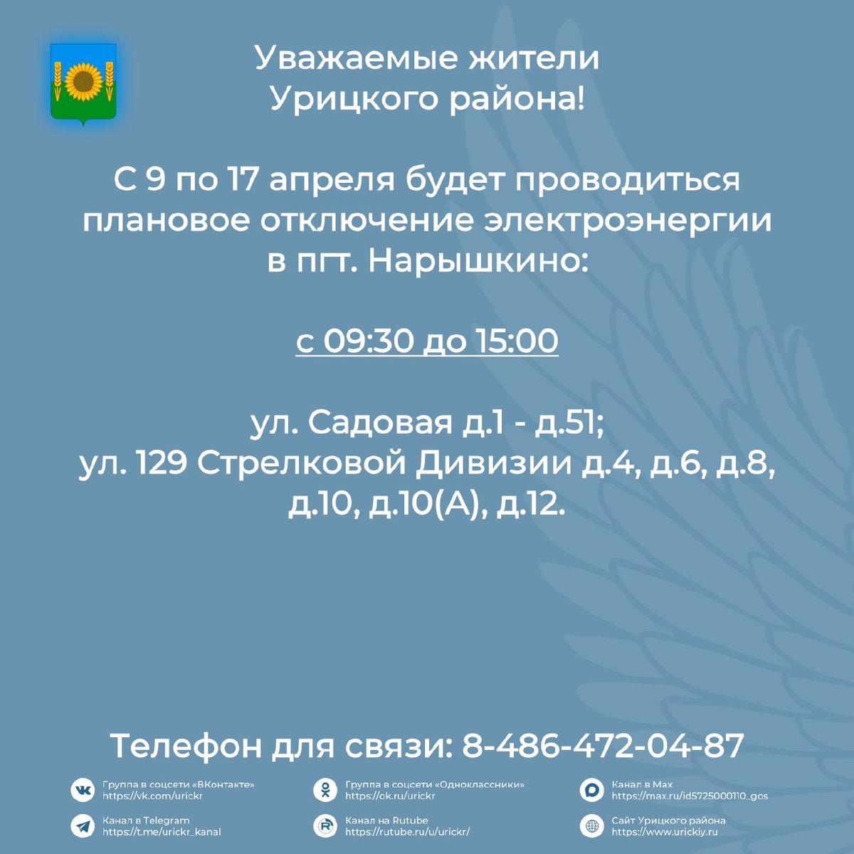 ! 📢 С 9 по 17 апреля будет проведено плановое отключение электроэнергии в поселке Нарышкино. Все подробности в карточках ⬆ #УрицкийРайон #АдминистрацияУрицкогорайонаОрловскойобласти #УрицкийРайон #АдминистрацияУрицкогорайонаОрловскойобласти