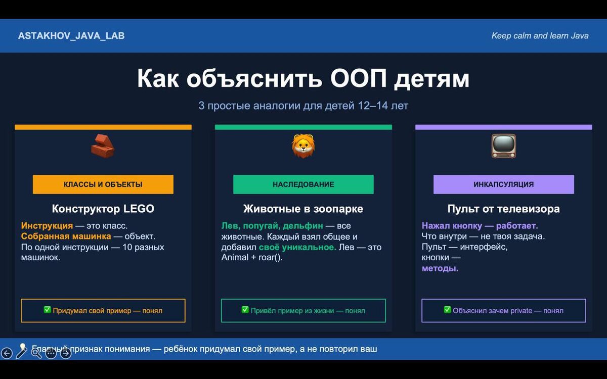 Ребёнок не понимает ООП не потому, что глупый. А потому, что ему объясняют абстрактно. ➡️Вот как объясняю я. Классы и объекты — через LEGO. Инструкция по сборке — это класс. Собранная машинка — объект. По одной инструкции можно собрать сто разных машинок. Дети понимают это мгновенно. Наследование — через зоопарк. Лев, попугай, дельфин — все животные. Все едят и спят. Но лев рычит, попугай говорит, дельфин плавает. Лев взял всё от класса «животное» и добавил своё. Это и есть наследование. Инкапсуляция — через пульт от телевизора. Нажал кнопку громкости — звук стал громче. Что происходит внутри телевизора — тебе не нужно знать. Кнопки есть, они работают. Всё остальное скрыто. Главный признак что ребёнок понял — он придумывает свой пример. Не повторяет мой. Придумывает сам. 👏 Собрал все три аналогии с практическими заданиями в памятку — для родителей и педагогов. Я в MAX Я в VK
