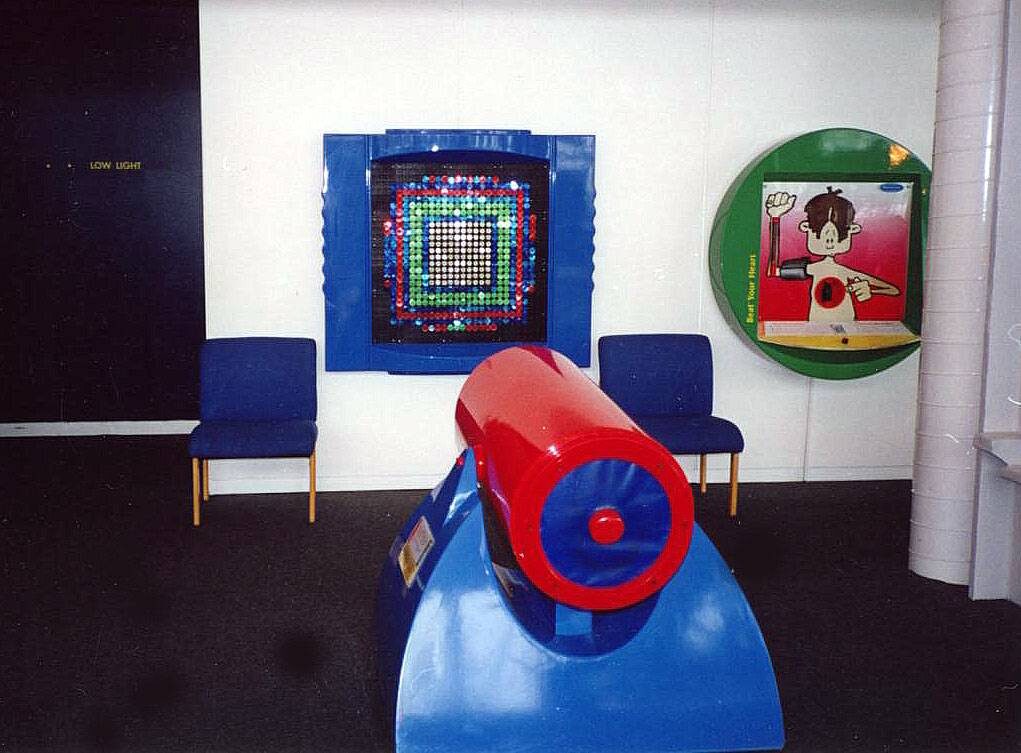 Воздушная пушка выполнена в виде горизонтального, тонкостенного, полого цилиндра. С одного торца цилиндр герметично затянут упругой прочной мембраной. Другой торец цилиндра закрыт крышкой с круговым отверстием. Если посетитель ударит рукой по мембране, воздух внутри цилиндра резко сжимается в объеме, и за счет упругости вылетает из отверстия в противоположном торце в виде воздушного тороидального вихря. Достигнув расположенной на расстоянии около 3 метров мишени из металлических разноцветных дисков, нашитых на кусок ткани, воздушный вихрь образует разбегающиеся концентрические круги из дисков мишени. Экспонат демонстрирует вихревое движение упругой воздушной среды. Экспонат расположен в музее «Techniquest» г. Кардиф, Уэльс, Великобритания.