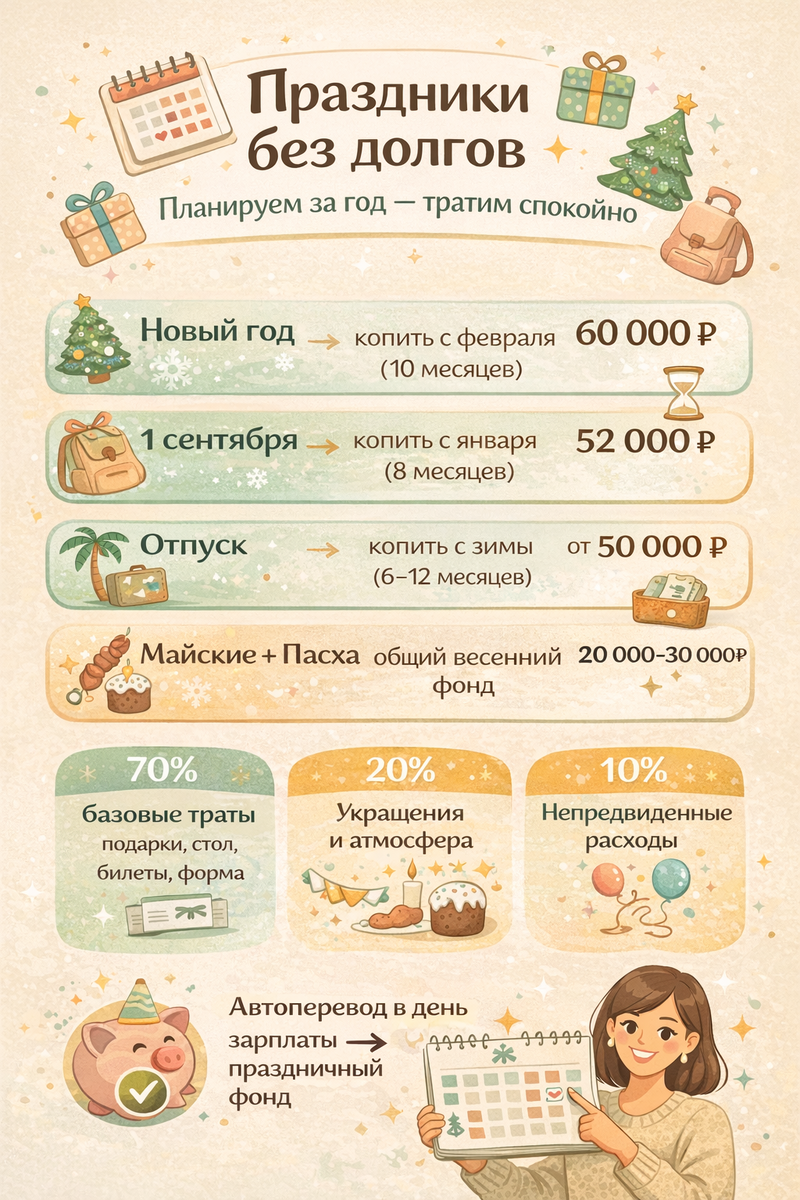 А потом до меня дошло. Крупные праздники и события — это не форс-мажор. Это сезонные расходы, которые можно и нужно планировать заранее. Как коммуналку или страховку за квартиру. Просто мы почему-то не воспринимаем их как обязательные платежи.