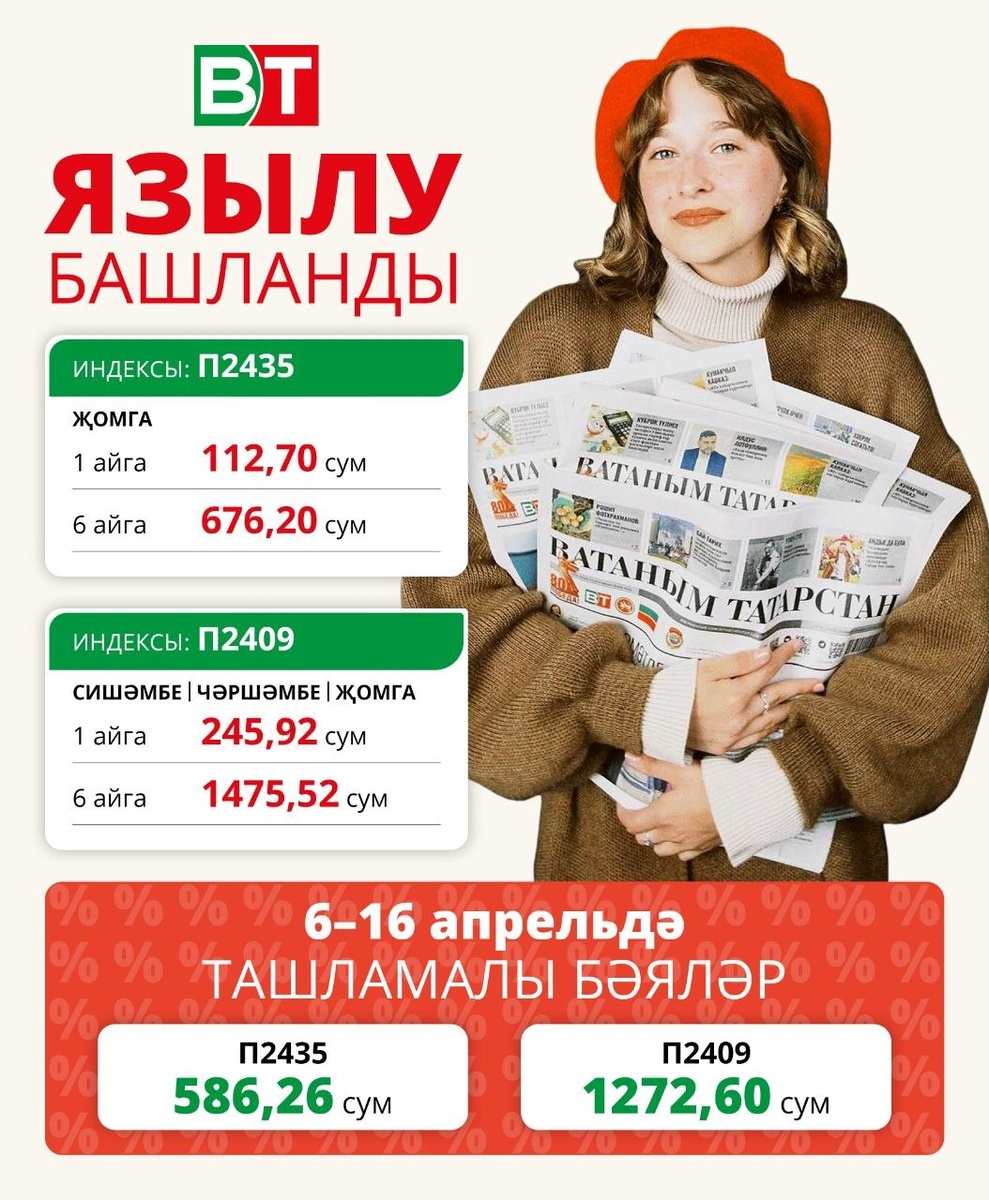 Нибары 10 көн! «Ватаным Татарстан»га ташламалы бәядән язылу башланды😍 6 апрельдан 16 апрельга кадәр «Ватаным Татарстан»га ташламалы бәядән язылып була! 2026 елның икенче яртыеллыгына газетага язылу бәяләре: 📬П2435 индексы буенча (атнага бер килә) – 586 сум 26 тиен 📬П2409 индексы буенча (атнага өч килә) – 1272 сум 60 тиен. ❗Почта бүлекчәсенә барып яки онлайн яздыру мөмкинлегегез булмаса, «ватсап»ка 89179270040 номерына «ПОДПИСКА» дип языгыз. Үзебез элемтәгә чыгып, яздырып бирербез