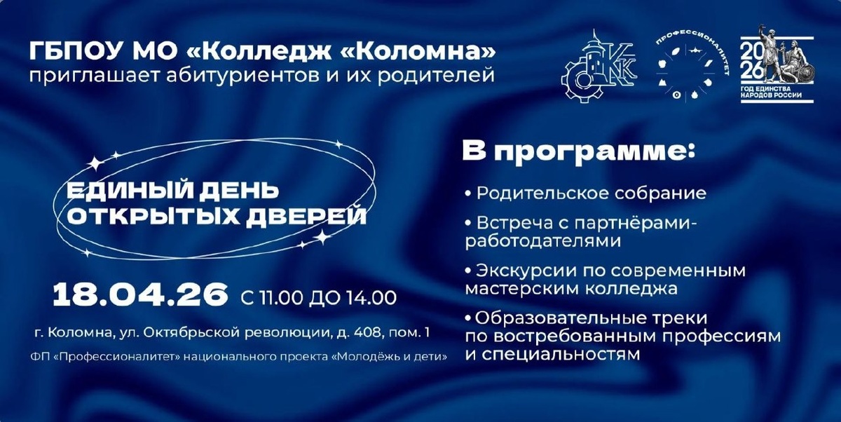 !🫶 Единый день открытых дверей ФП #Профессионалитет национального проекта «Молодежь и дети» в Колледже "Коломна"! 🎓 📅 Когда? Суббота, 18 апреля 2026 г. ⏰ Во сколько? 11:00-14:00 Ждём абитуриентов и родителей! 🚪 Экскурсии 🎨 Интерактивы 👪 Родительское собрание 🛠 Современные мастерские Выбери свою профессию! #СПОмедиа #КолледжКоломна #Профессионалитет #ИРПО #ЕДОД_СПО #КЧ_ЕДОД2026